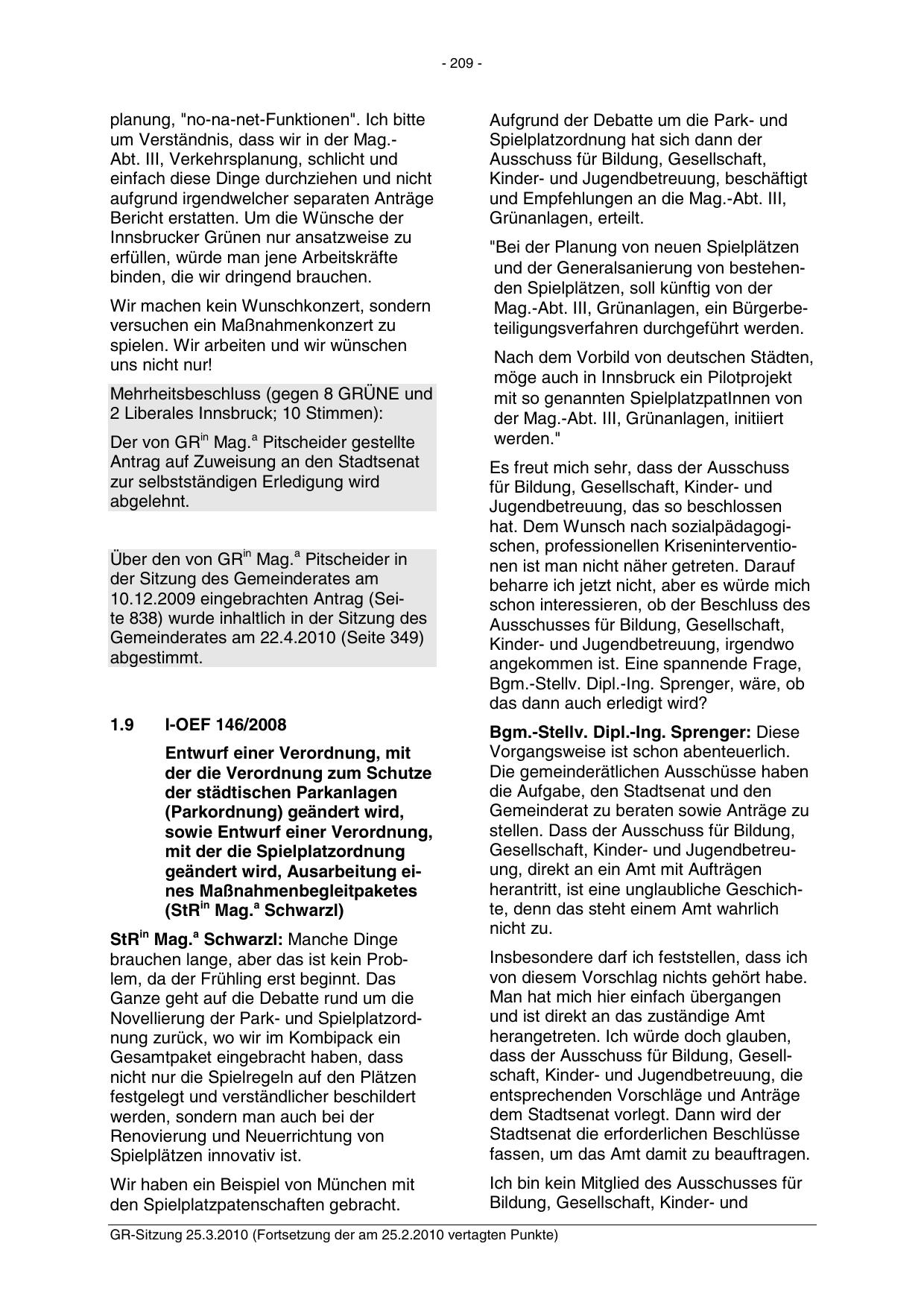 Novellierung der Park- und Spielplatzordnung zurück, wo wir im Kombipack ein