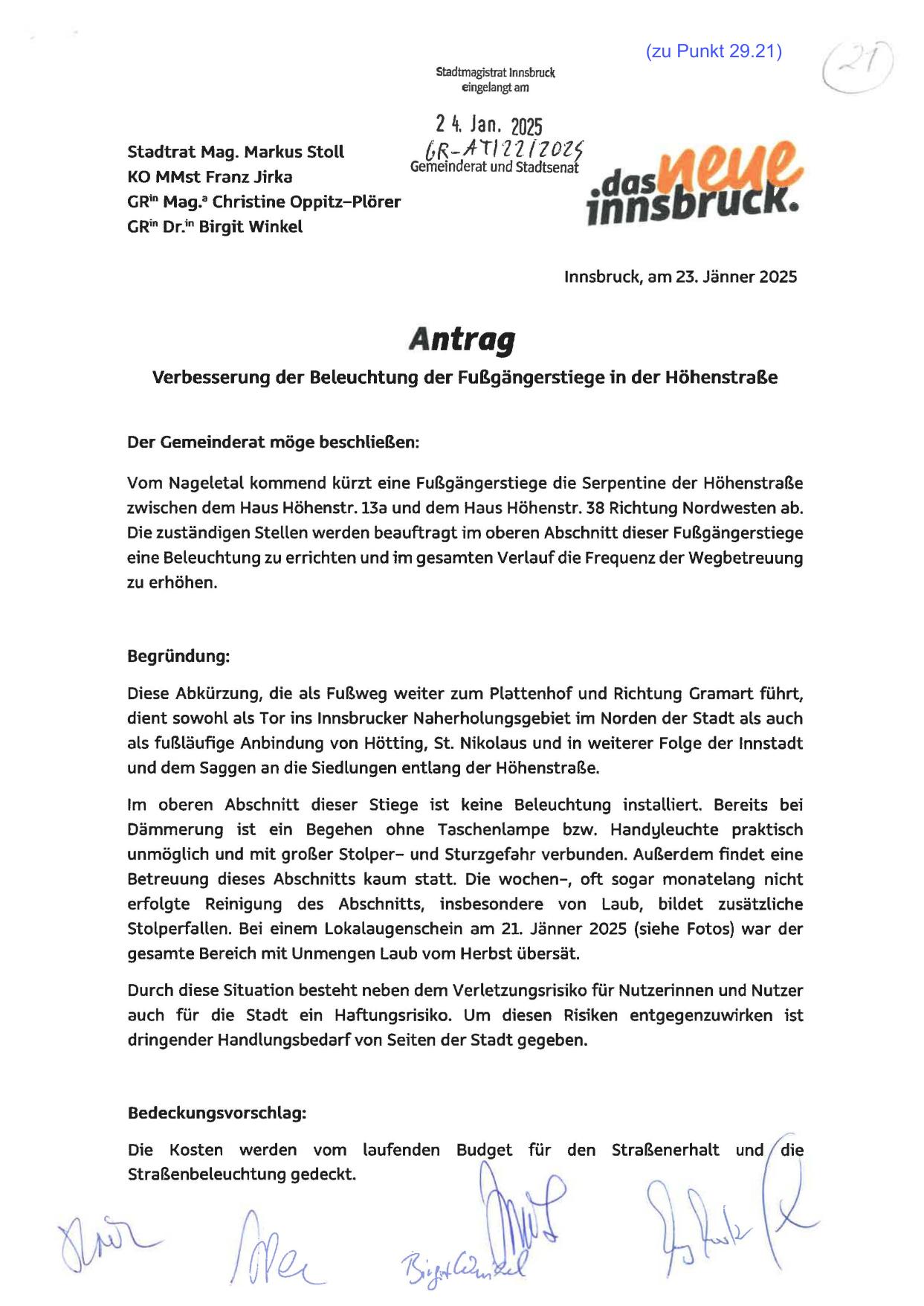 Verbesserung der Beleuchtung der Fußgängerstiege in der Höhenstraße