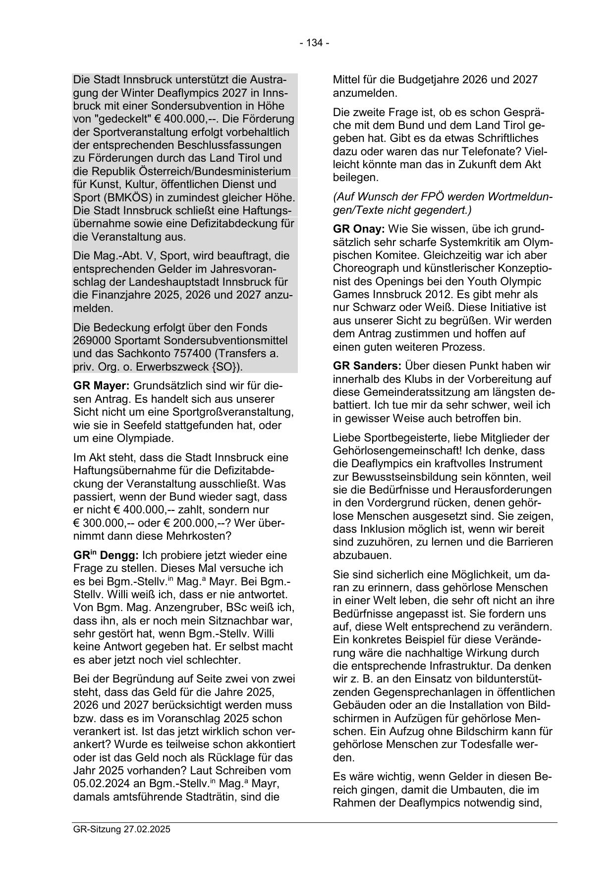 Die Stadt Innsbruck unterstützt die Austragung der Winter Deaflympics 2027 in Innsbruck mit einer Sondersubvention in Höhe