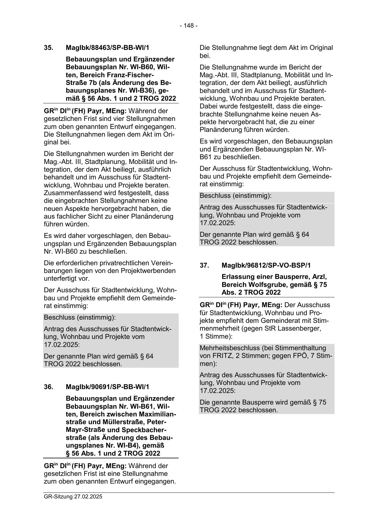 Bebauungsplan Nr. WI-B60, Wilten, Bereich Franz-FischerStraße 7b (als Änderung des Bebauungsplanes Nr. WI-B36), gemäß § 56 Abs. 1 und 2 TROG 2022