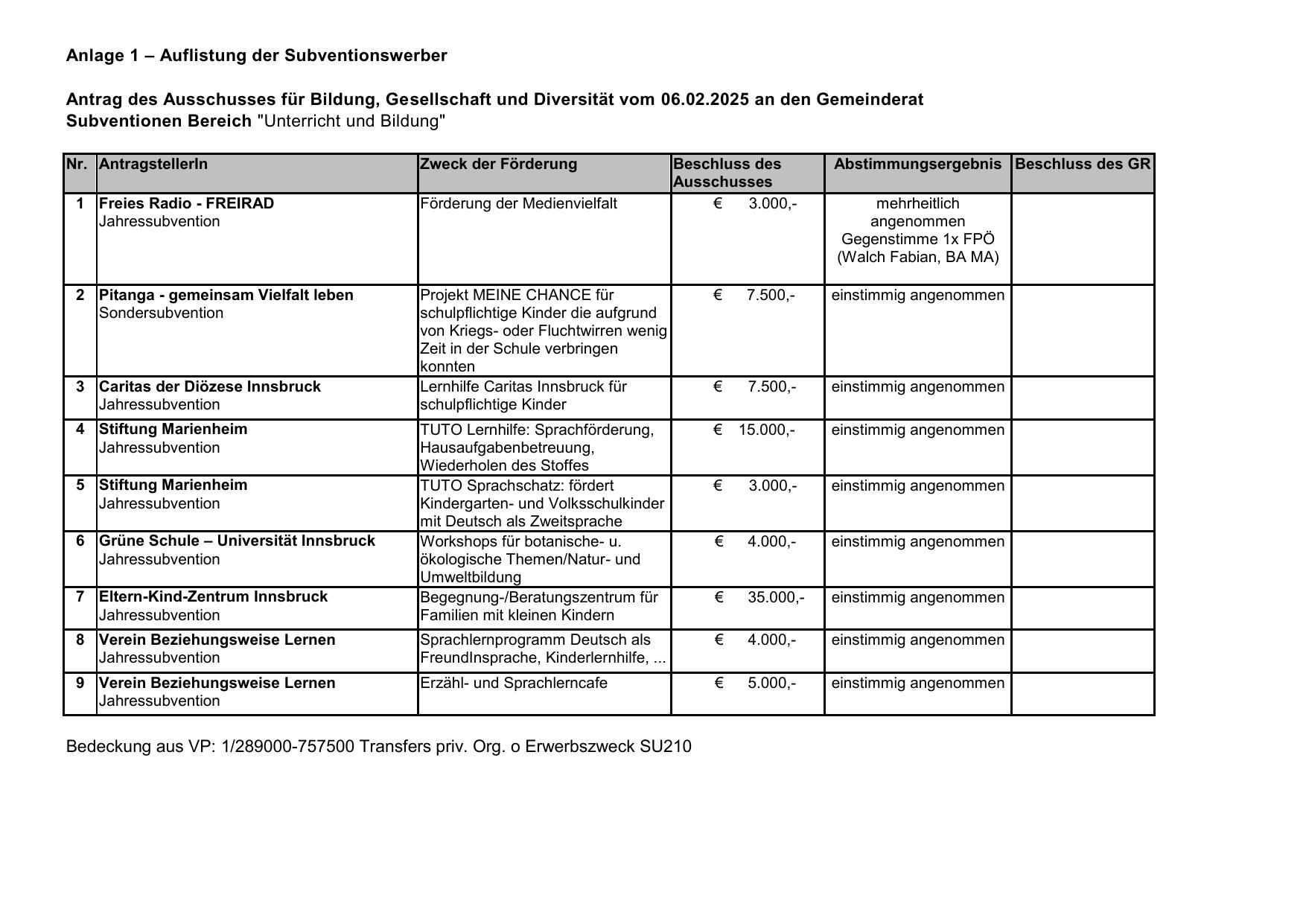Anlage 1 – Auflistung der Subventionswerber