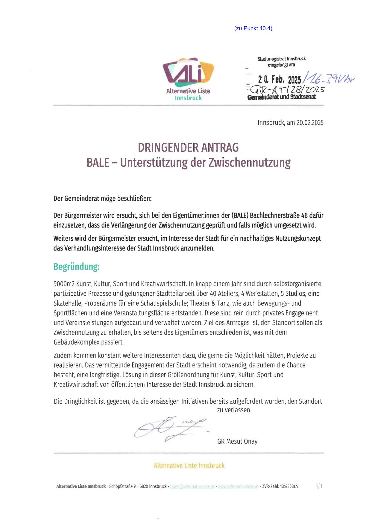 Der Bürgermeister wird ersucht, sich bei den Eigentümer:innen der (BALE) Bachlechnerstraße 46 dafür