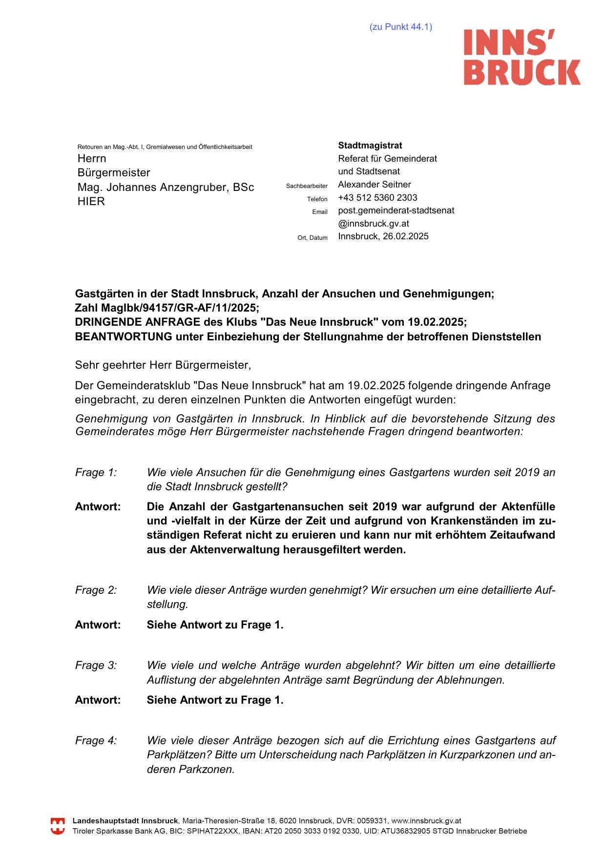 DRINGENDE ANFRAGE des Klubs "Das Neue Innsbruck" vom 19.02.2025;