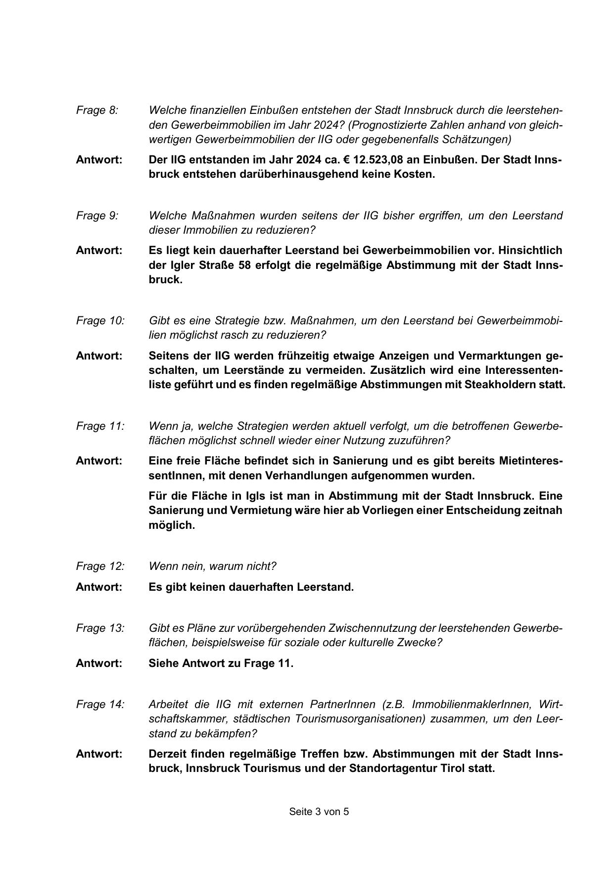 Welche finanziellen Einbußen entstehen der Stadt Innsbruck durch die leerstehenden Gewerbeimmobilien im Jahr 2024? (Prognostizierte Zahlen anhand von gleichwertigen Gewerbeimmobilien der IIG oder gegebenenfalls Schätzungen)