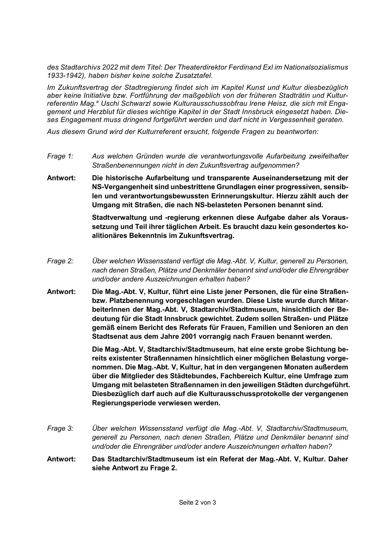 aber keine Initiative bzw. Fortführung der maßgeblich von der früheren Stadträtin und Kulturreferentin Mag.a Uschi Schwarzl sowie Kulturausschussobfrau lrene Heisz, die sich mit Engagement und Herzblut für dieses wichtige Kapitel in der Stadt Innsbruck eingesetzt haben. Dieses Engagement muss dringend fortgeführt werden und darf nicht in Vergessenheit geraten.