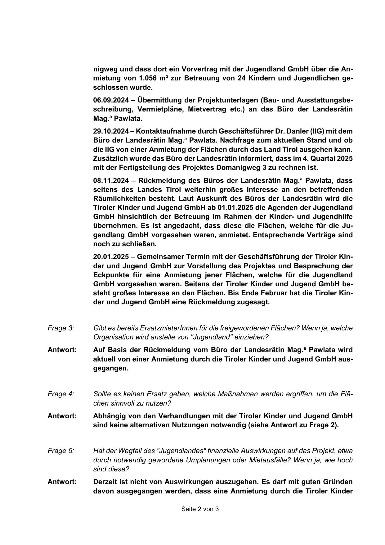 GmbH vorgesehen waren. Seitens der Tiroler Kinder und Jugend GmbH besteht großes Interesse an den Flächen. Bis Ende Februar hat die Tiroler Kinder und Jugend GmbH eine Rückmeldung zugesagt.