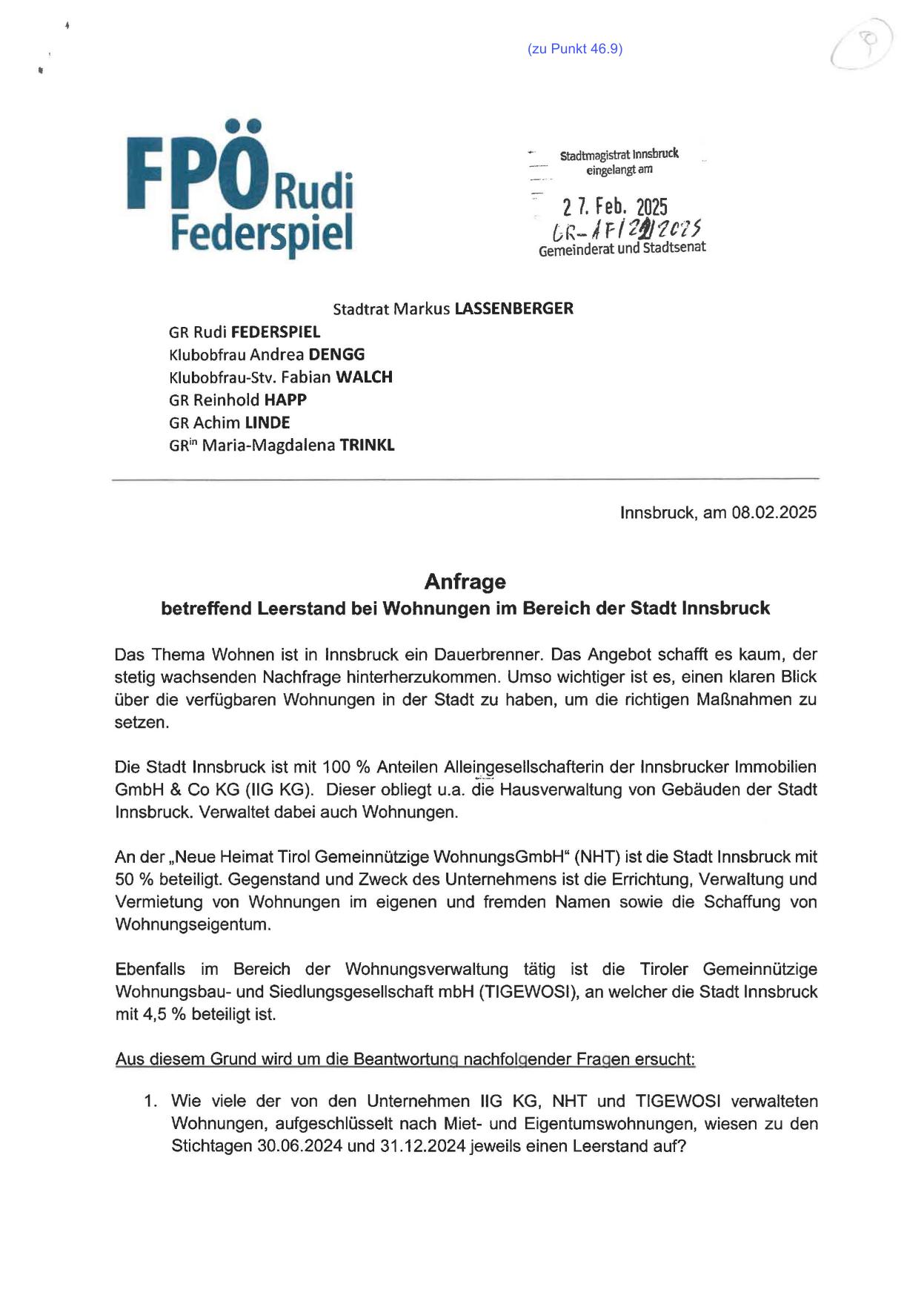 betreffend Leerstand bei Wohnungen im Bereich der Stadt Innsbruck