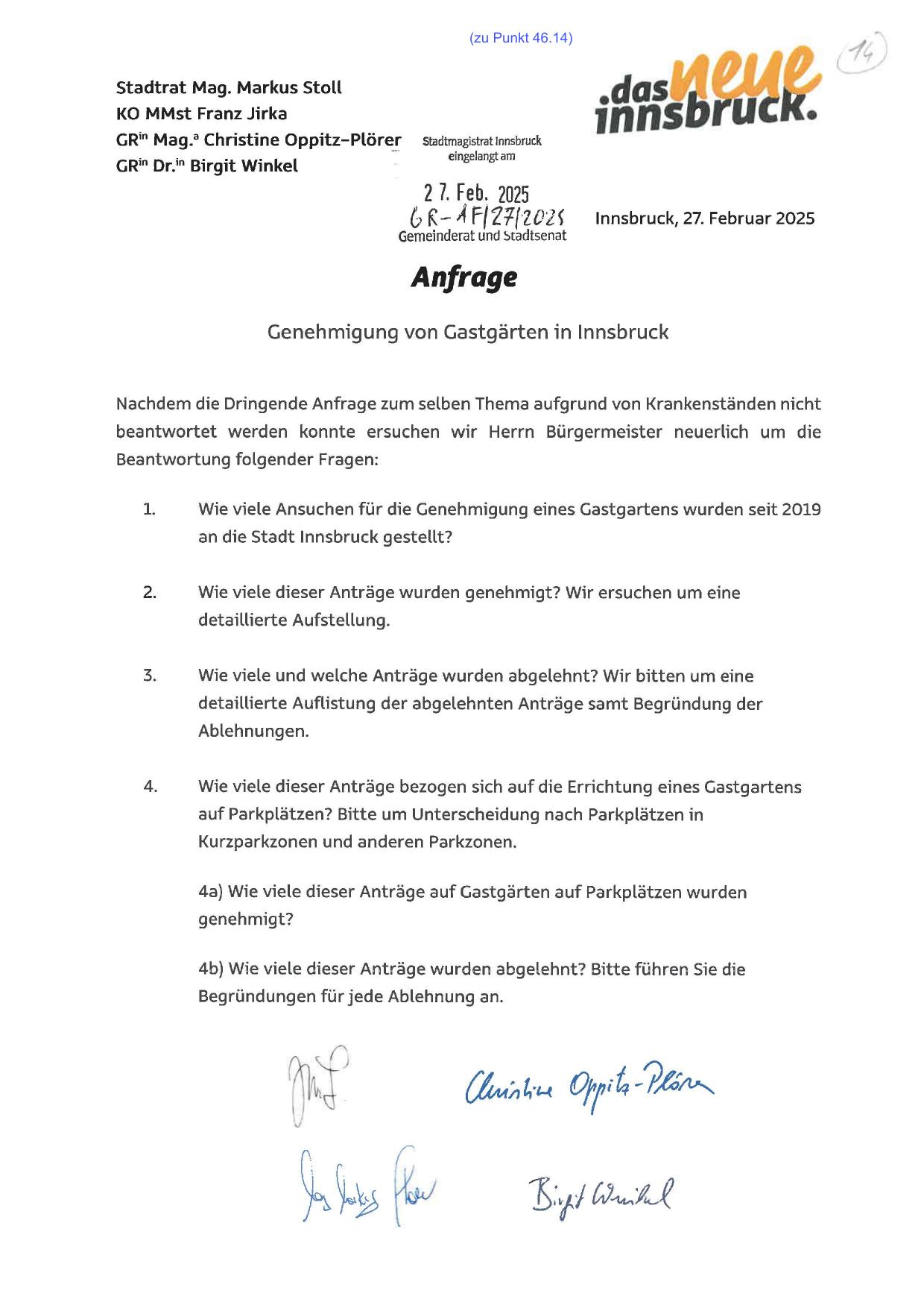 an die Stadt Innsbruck gestellt?