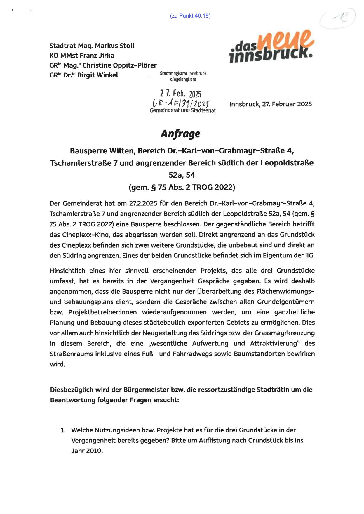 vor allem auch hinsichtlich der Neugestaltung des Südrings bzw. der Grassmayrkreuzung