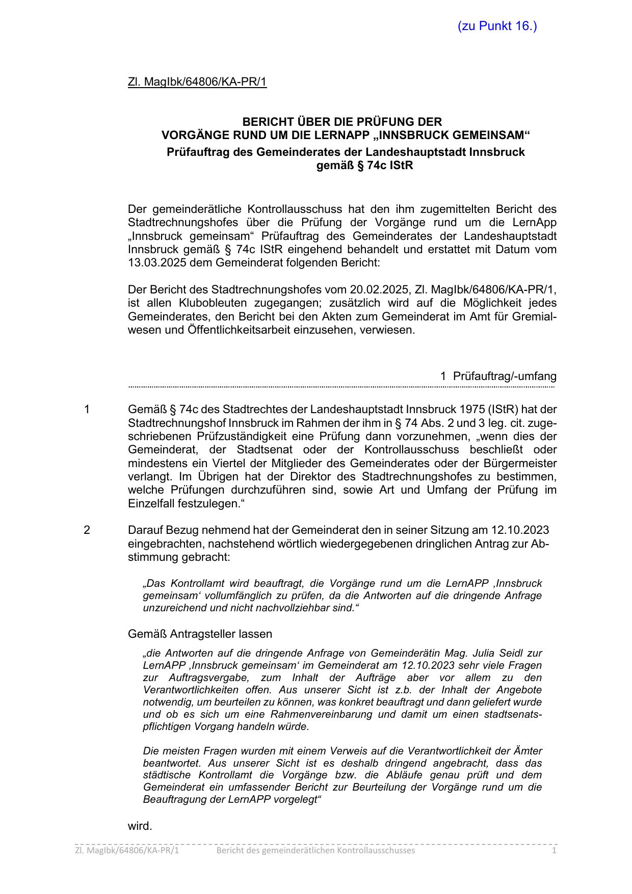 Prüfauftrag des Gemeinderates der Landeshauptstadt Innsbruck