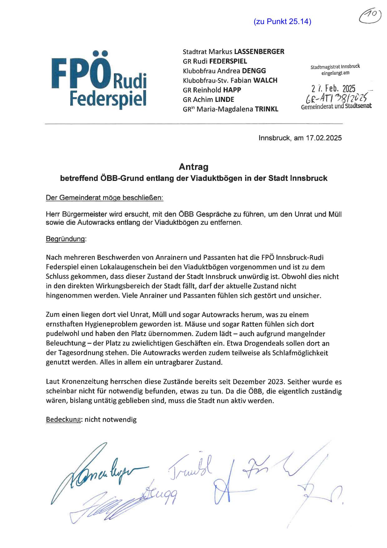Herr Bürgermeister wird ersucht, mit den ÖBB Gespräche zu führen, um den Unrat und Müll