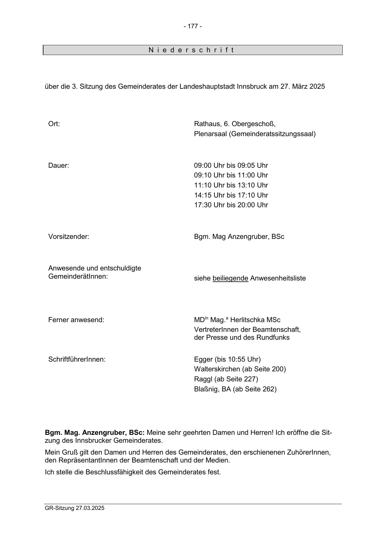 Bgm. Mag. Anzengruber, BSc: Meine sehr geehrten Damen und Herren! Ich eröffne die Sitzung des Innsbrucker Gemeinderates.