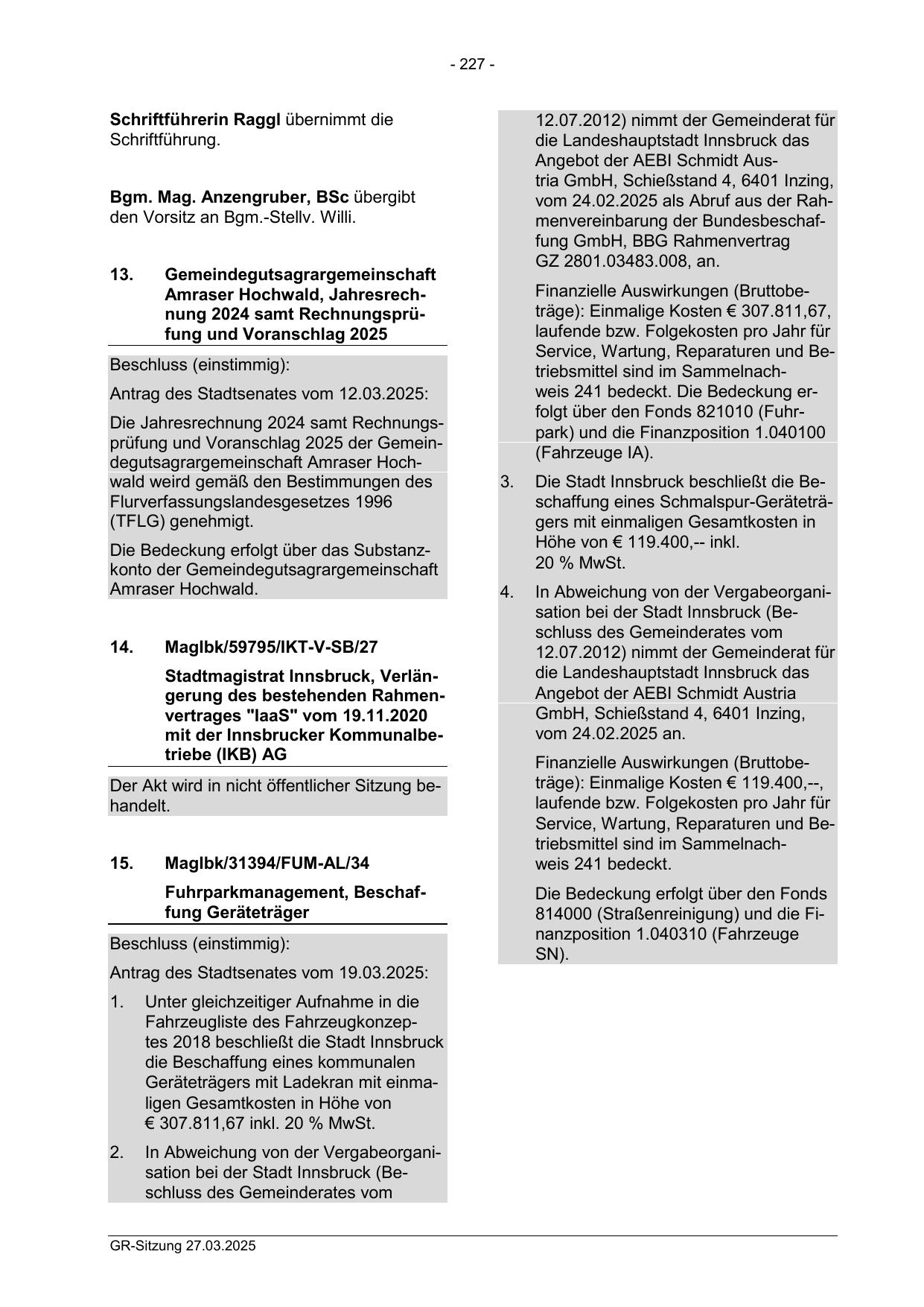 Die Jahresrechnung 2024 samt Rechnungsprüfung und Voranschlag 2025 der Gemeindegutsagrargemeinschaft Amraser Hochwald weird gemäß den Bestimmungen des