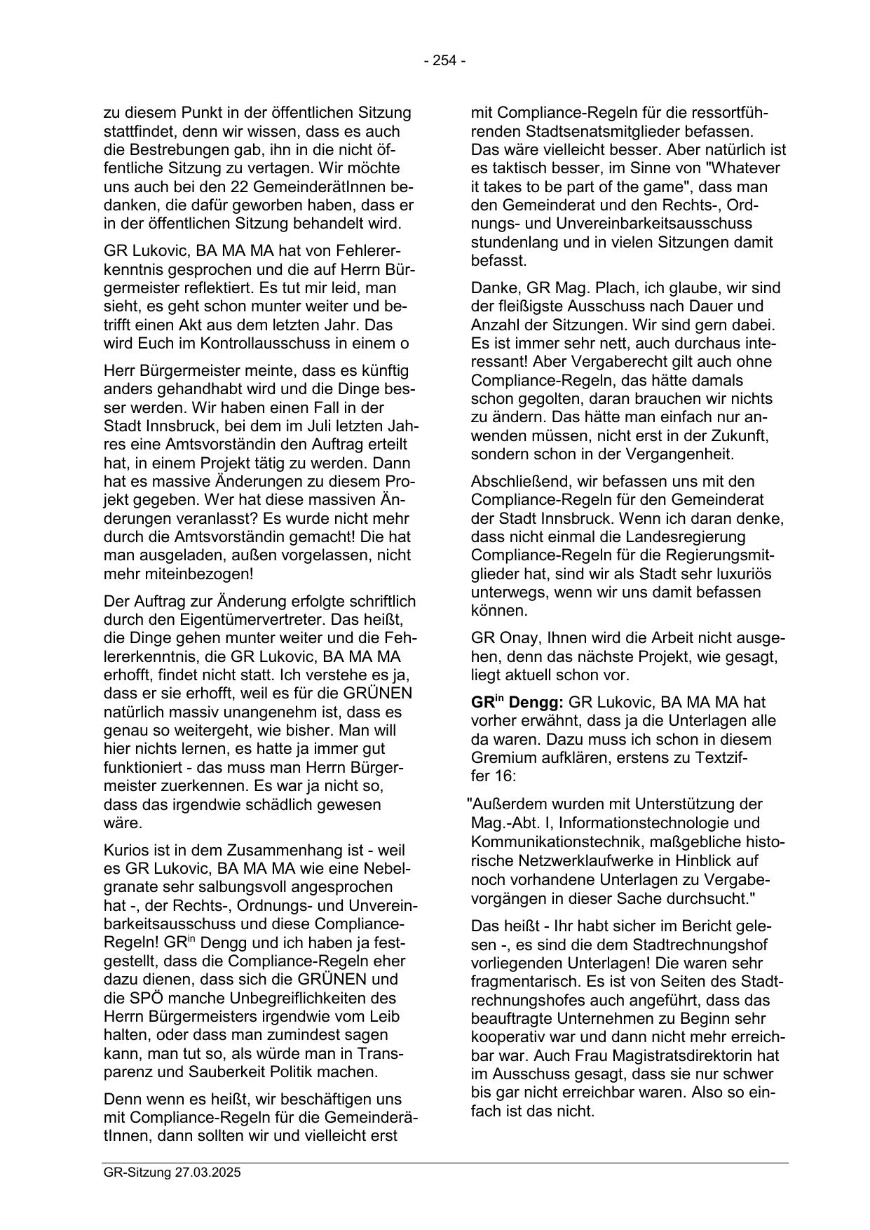 hat -, der Rechts-, Ordnungs- und Unvereinbarkeitsausschuss und diese ComplianceRegeln! GRin Dengg und ich haben ja festgestellt, dass die Compliance-Regeln eher