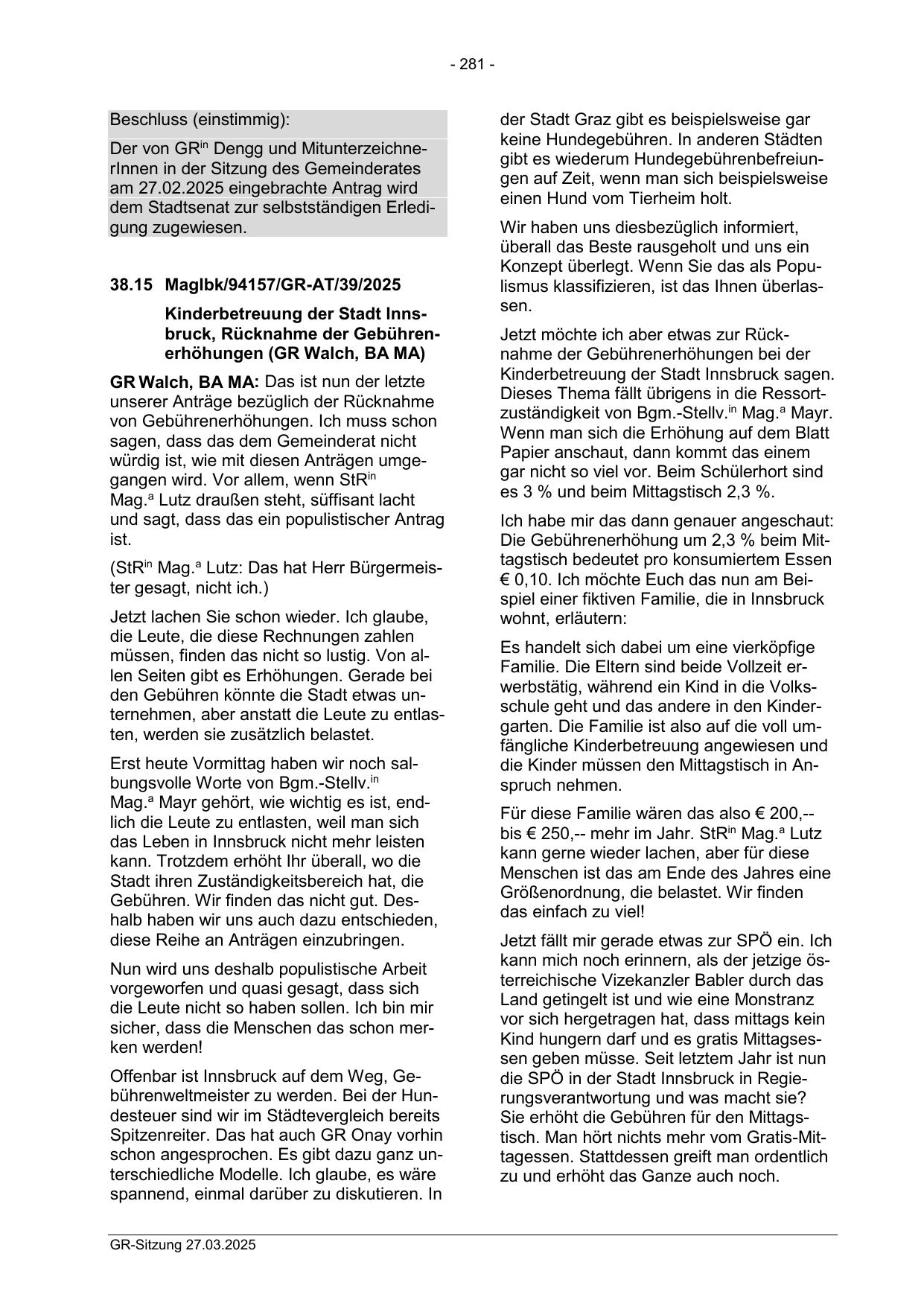 Kinderbetreuung der Stadt Innsbruck, Rücknahme der Gebührenerhöhungen (GR Walch, BA MA)
