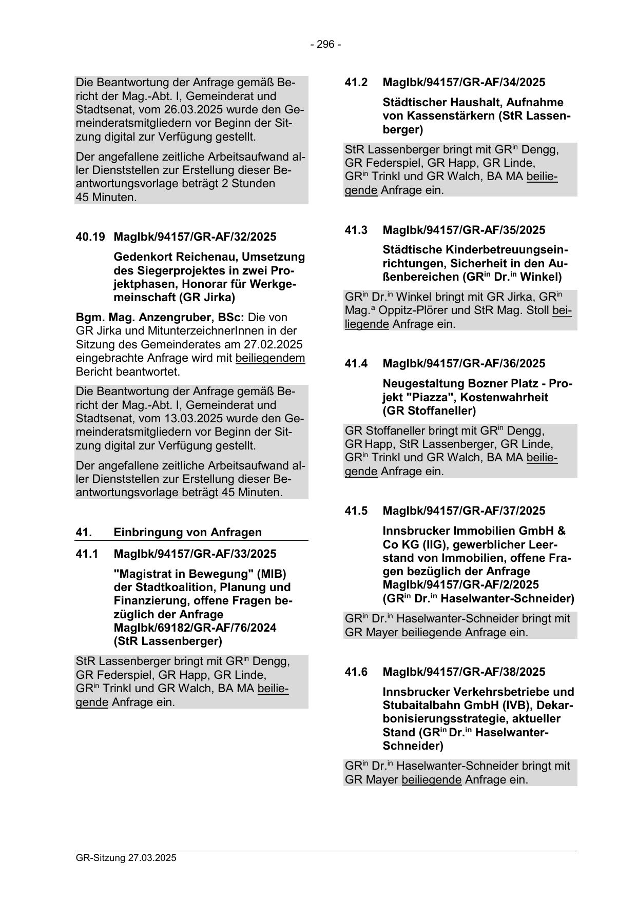 Die Beantwortung der Anfrage gemäß Bericht der Mag.-Abt. I, Gemeinderat und