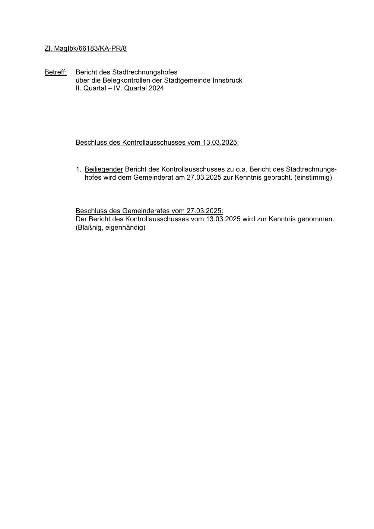 1. Beiliegender Bericht des Kontrollausschusses zu o.a. Bericht des Stadtrechnungshofes wird dem Gemeinderat am 27.03.2025 zur Kenntnis gebracht. (einstimmig)