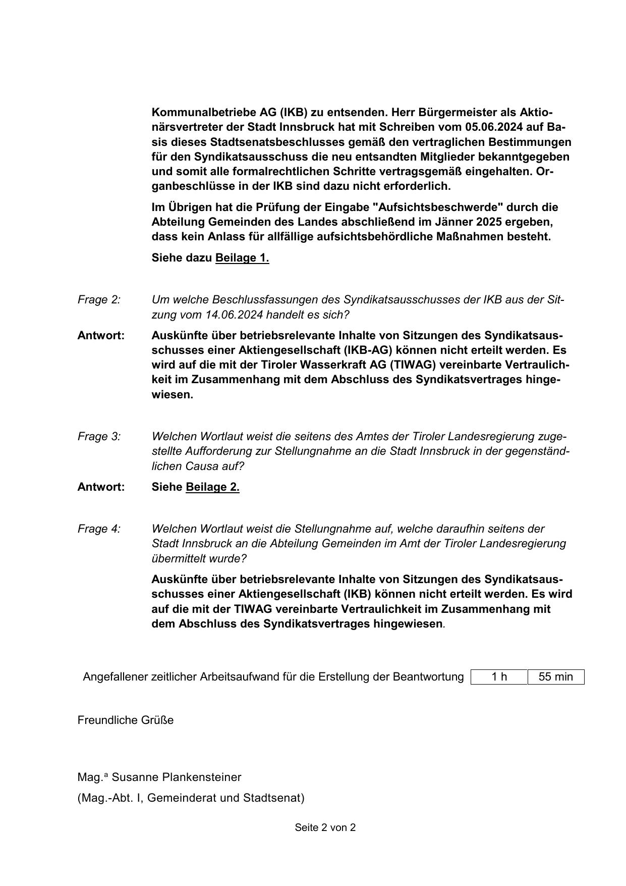 AktioKommunalbetriebe AG (IKB) zu entsenden. Herr Bürgermeister als Aktionärsvertreter der Stadt Innsbruck hat mit Schreiben vom 05.06.2024 auf Basis dieses Stadtsenatsbeschlusses gemäß den vertraglichen Bestimmungen