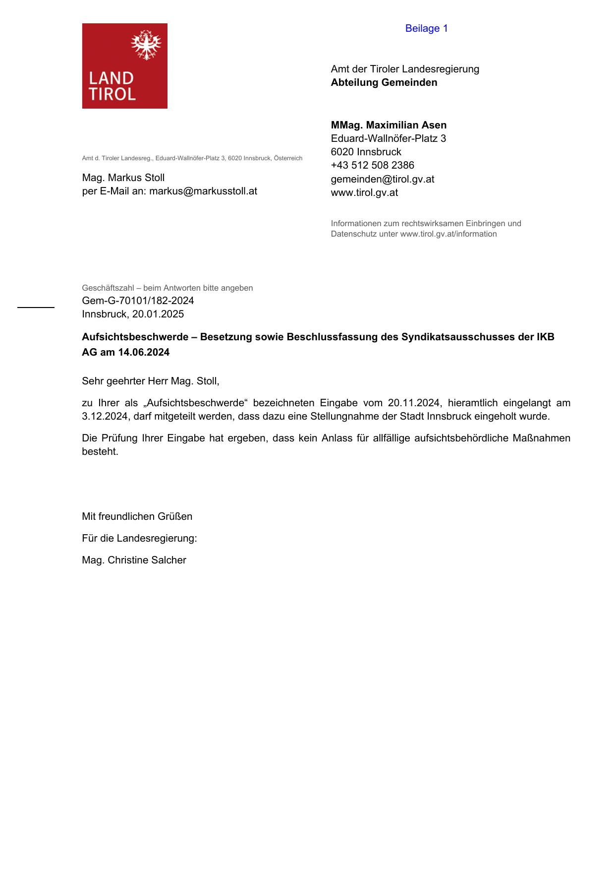 3.12.2024, darf mitgeteilt werden, dass dazu eine Stellungnahme der Stadt Innsbruck eingeholt wurde.