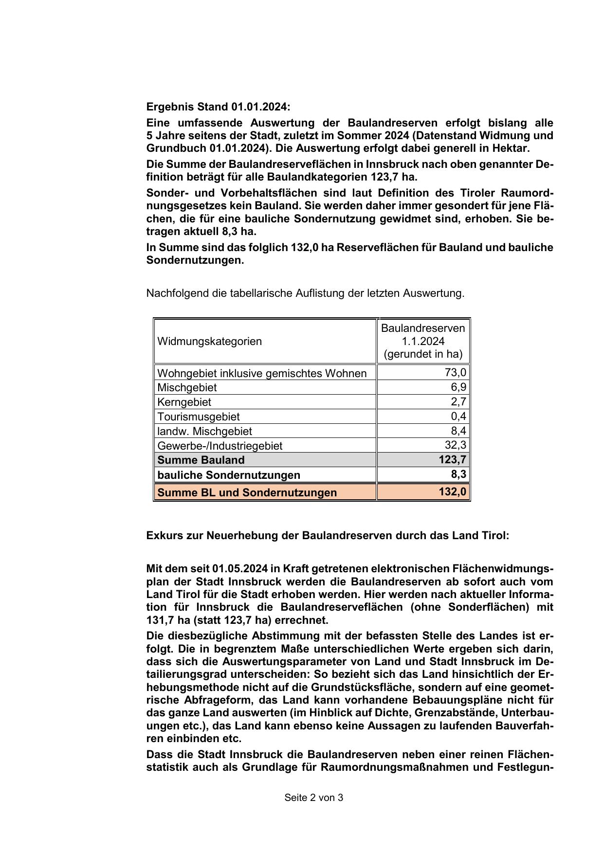 Land Tirol für die Stadt erhoben werden. Hier werden nach aktueller Information für Innsbruck die Baulandreserveflächen (ohne Sonderflächen) mit