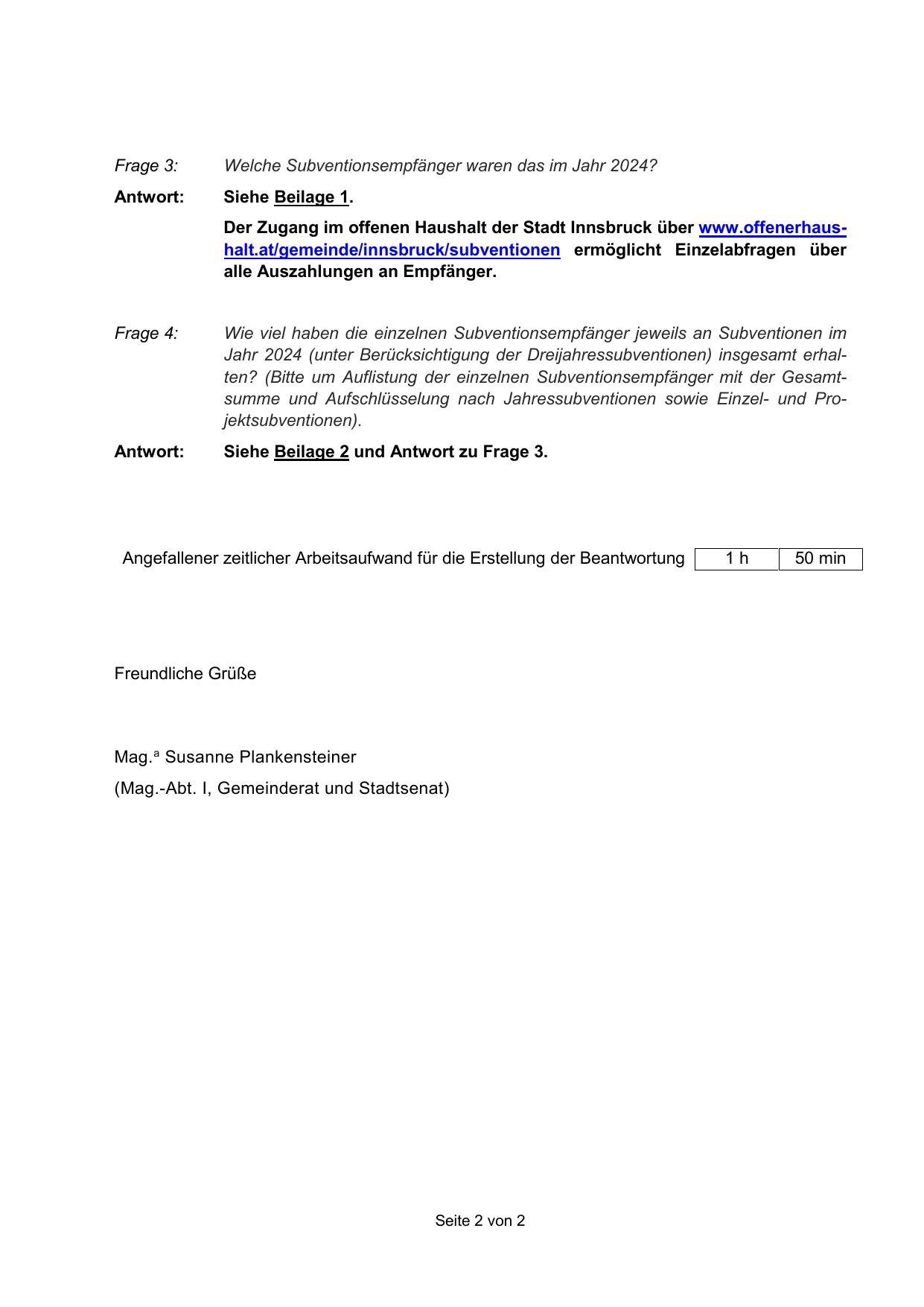 Angefallener zeitlicher Arbeitsaufwand für die Erstellung der Beantwortung