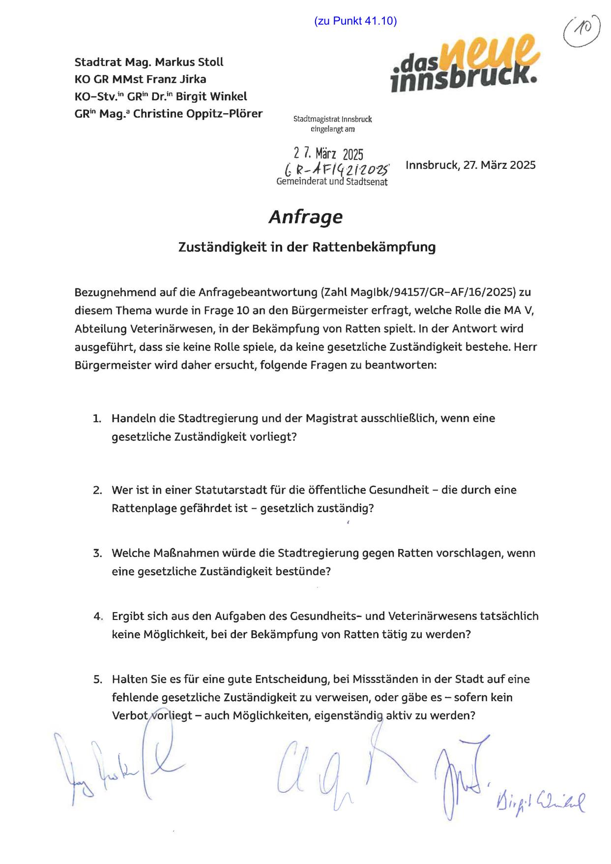 Bürgermeister wird daher ersucht, folgende Fragen zu beantworten:
