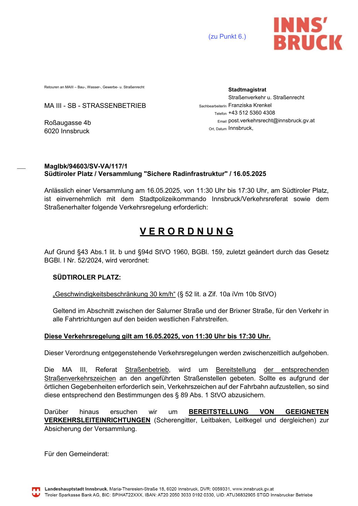 ist einvernehmlich mit dem Stadtpolizeikommando Innsbruck/Verkehrsreferat sowie dem
