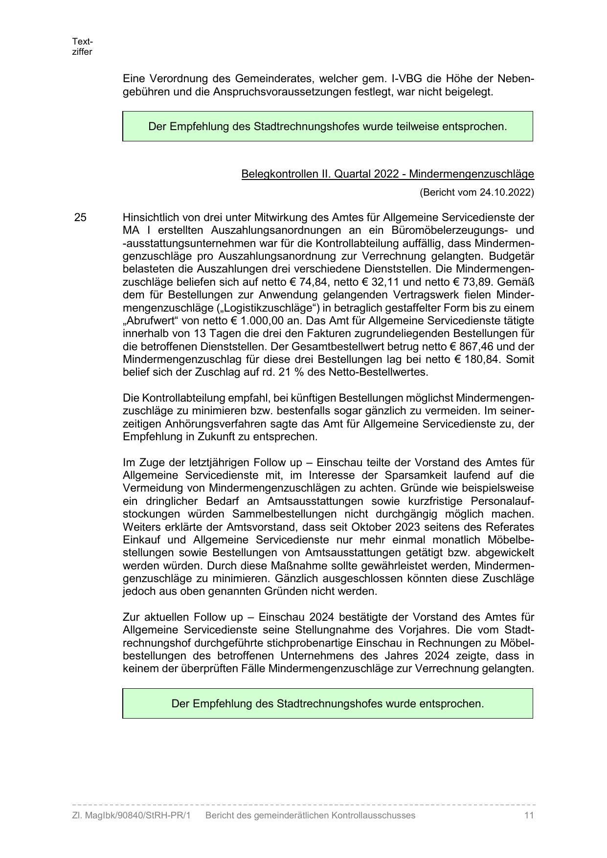 Allgemeine Servicedienste seine Stellungnahme des Vorjahres. Die vom Stadtrechnungshof durchgeführte stichprobenartige Einschau in Rechnungen zu Möbelbestellungen des betroffenen Unternehmens des Jahres 2024 zeigte, dass in