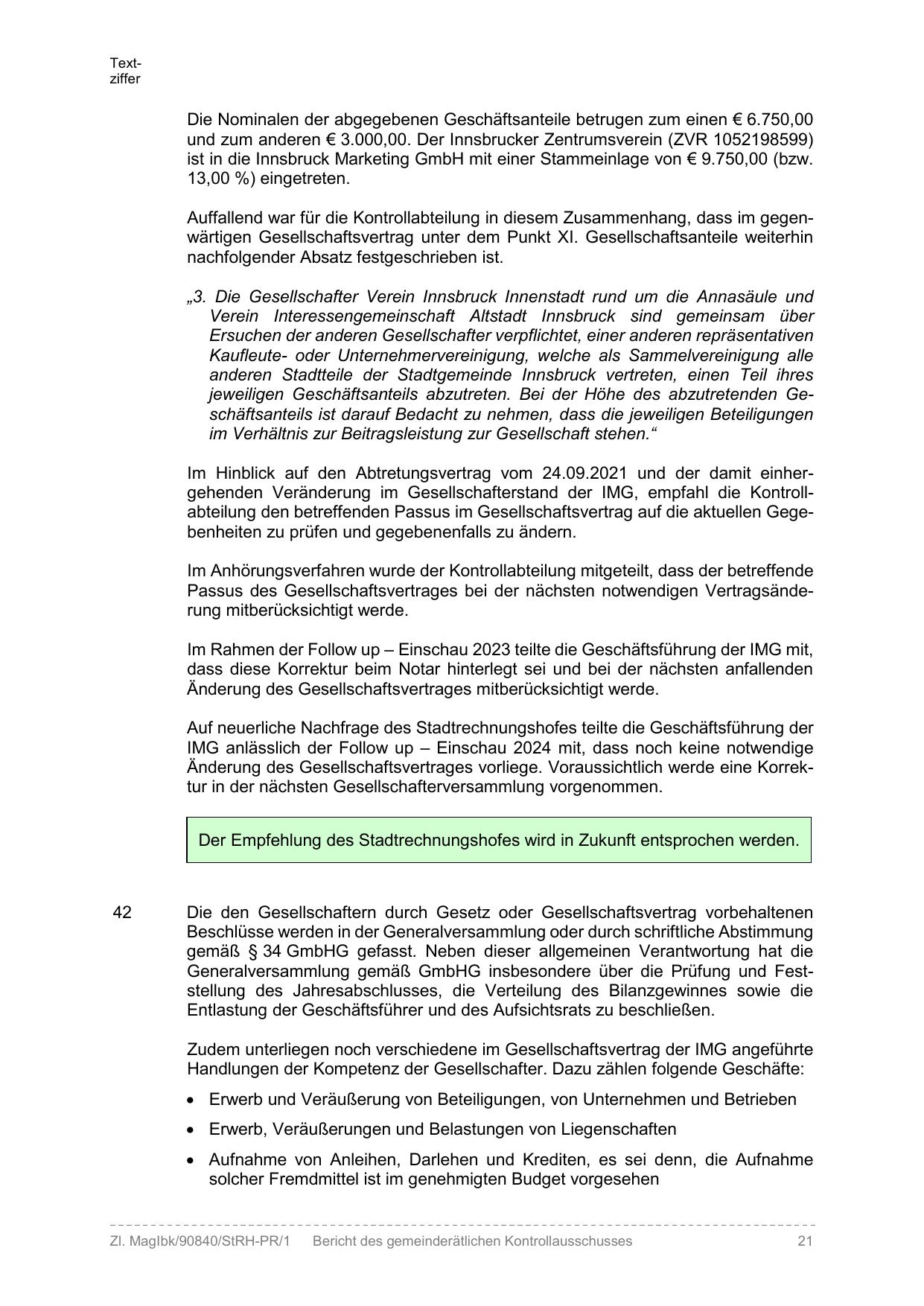 Im Hinblick auf den Abtretungsvertrag vom 24.09.2021 und der damit einhergehenden Veränderung im Gesellschafterstand der IMG, empfahl die Kontrollabteilung den betreffenden Passus im Gesellschaftsvertrag auf die aktuellen Gegebenheiten zu prüfen und gegebenenfalls zu ändern.