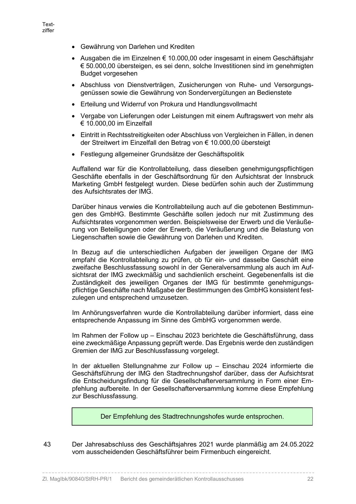 Darüber hinaus verwies die Kontrollabteilung auch auf die gebotenen Bestimmungen des GmbHG. Bestimmte Geschäfte sollen jedoch nur mit Zustimmung des