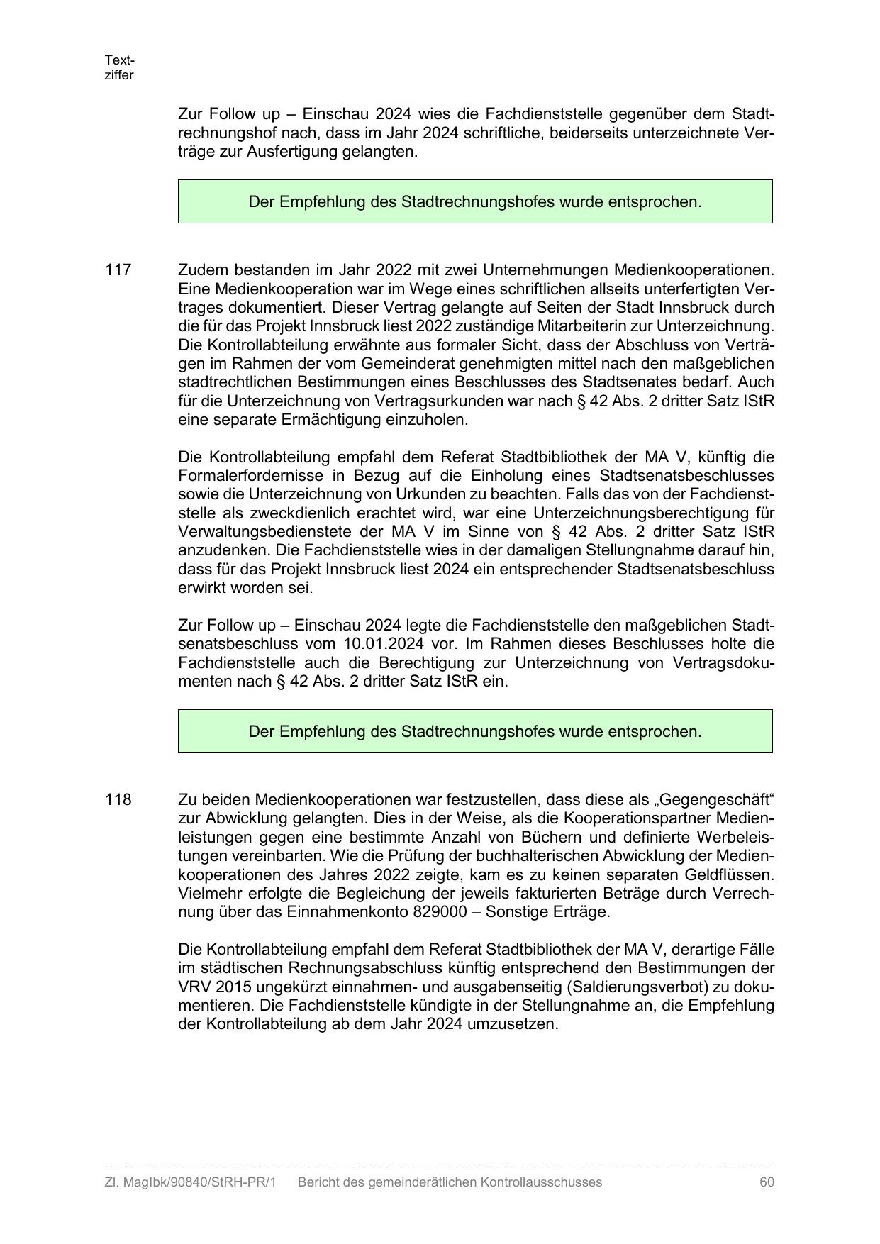 zur Abwicklung gelangten. Dies in der Weise, als die Kooperationspartner Medienleistungen gegen eine bestimmte Anzahl von Büchern und definierte Werbeleistungen vereinbarten. Wie die Prüfung der buchhalterischen Abwicklung der Medienkooperationen des Jahres 2022 zeigte, kam es zu keinen separaten Geldflüssen.