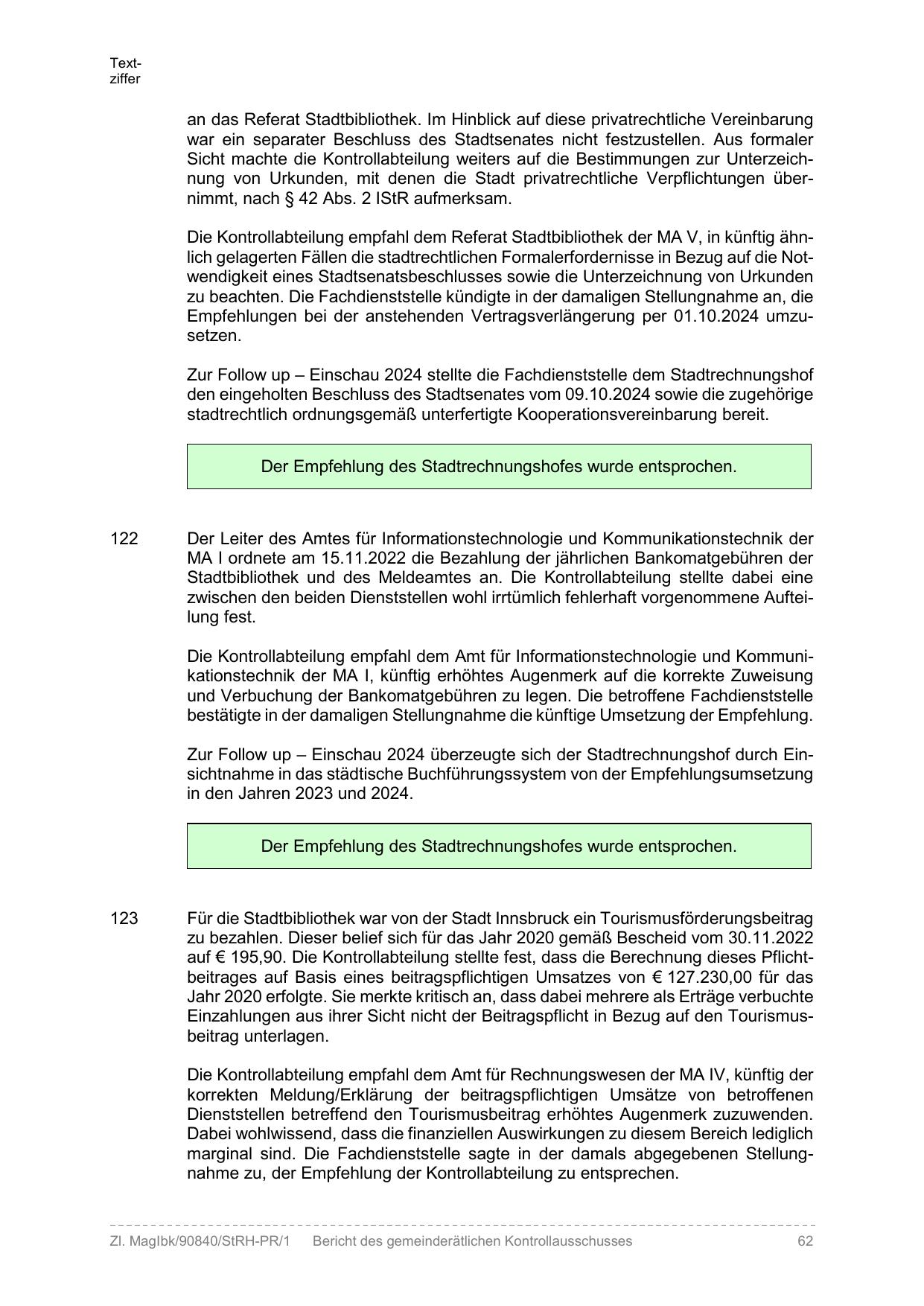 Die Kontrollabteilung empfahl dem Referat Stadtbibliothek der MA V, in künftig ähnlich gelagerten Fällen die stadtrechtlichen Formalerfordernisse in Bezug auf die Notwendigkeit eines Stadtsenatsbeschlusses sowie die Unterzeichnung von Urkunden