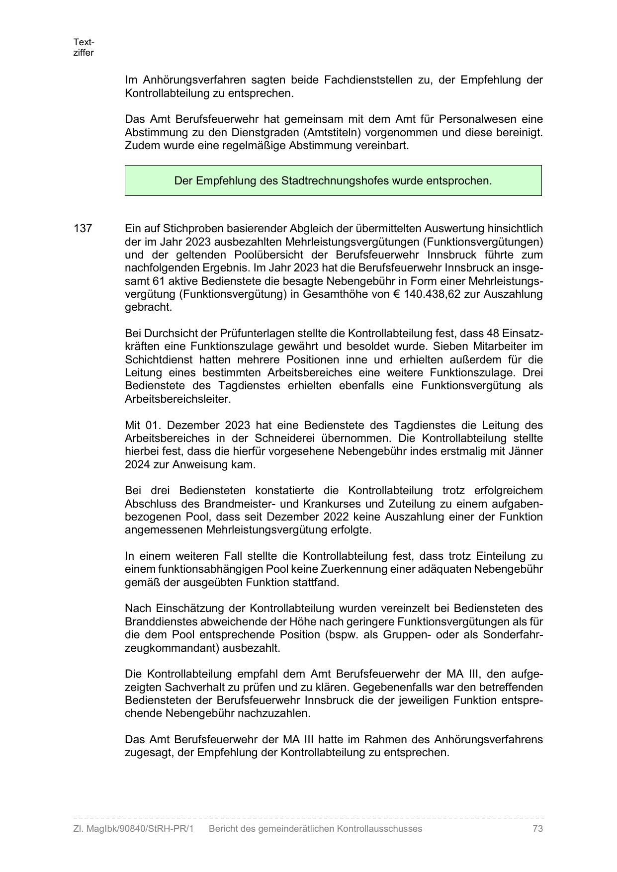 nachfolgenden Ergebnis. Im Jahr 2023 hat die Berufsfeuerwehr Innsbruck an insgesamt 61 aktive Bedienstete die besagte Nebengebühr in Form einer Mehrleistungsvergütung (Funktionsvergütung) in Gesamthöhe von € 140.438,62 zur Auszahlung