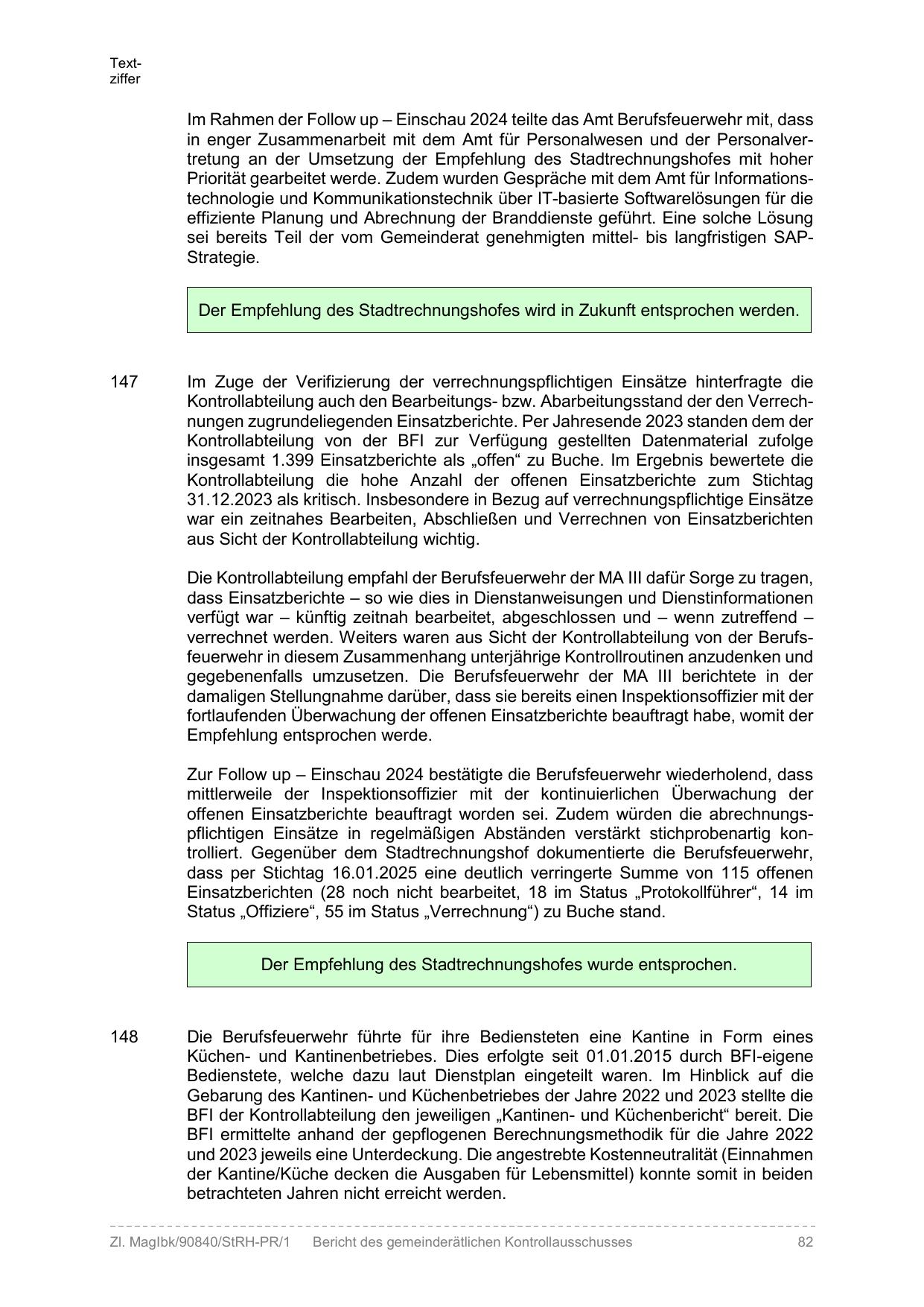 offenen Einsatzberichte beauftragt worden sei. Zudem würden die abrechnungspflichtigen Einsätze in regelmäßigen Abständen verstärkt stichprobenartig kontrolliert. Gegenüber dem Stadtrechnungshof dokumentierte die Berufsfeuerwehr,