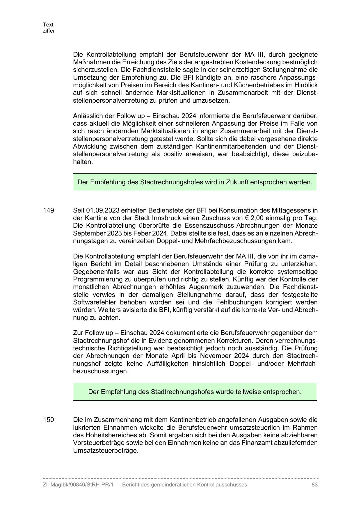 Die Kontrollabteilung empfahl der Berufsfeuerwehr der MA III, die von ihr im damaligen Bericht im Detail beschriebenen Umstände einer Prüfung zu unterziehen.