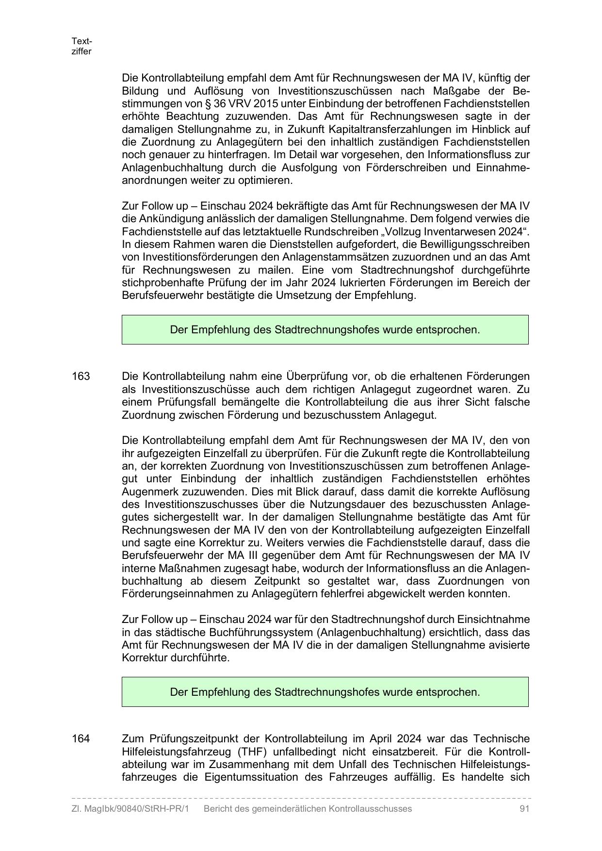 Zur Follow up – Einschau 2024 bekräftigte das Amt für Rechnungswesen der MA IV