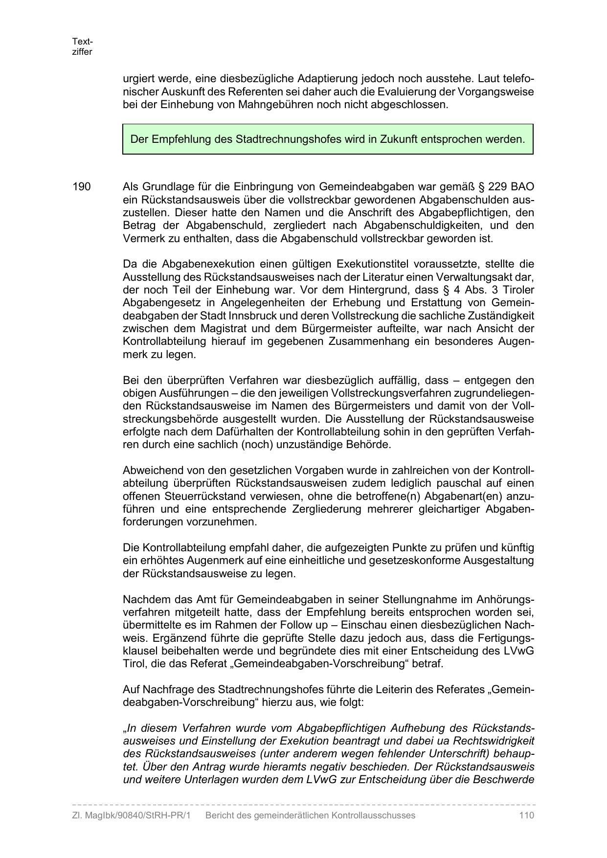 Abweichend von den gesetzlichen Vorgaben wurde in zahlreichen von der Kontrollabteilung überprüften Rückstandsausweisen zudem lediglich pauschal auf einen