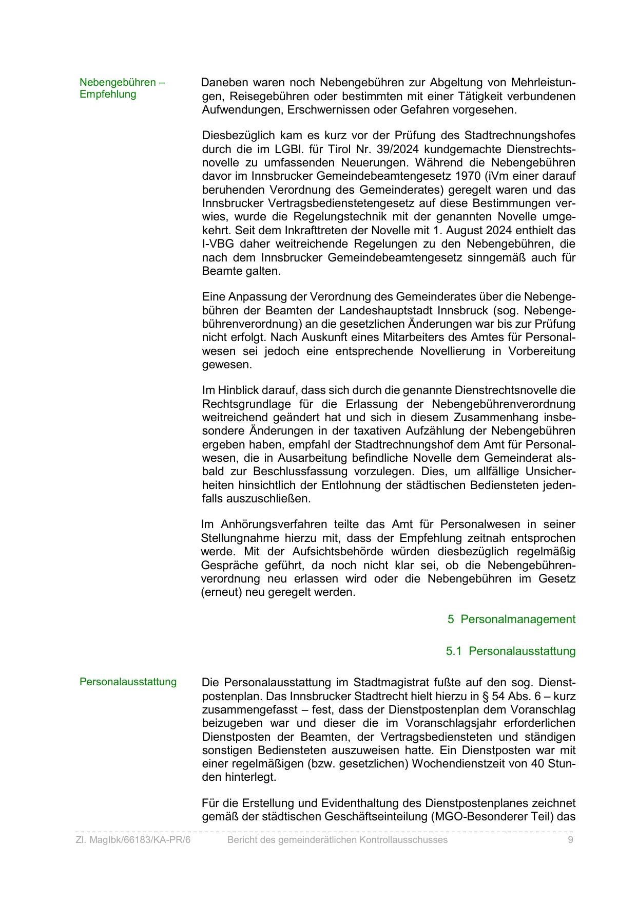 Eine Anpassung der Verordnung des Gemeinderates über die Nebengebühren der Beamten der Landeshauptstadt Innsbruck (sog. Nebengebührenverordnung) an die gesetzlichen Änderungen war bis zur Prüfung