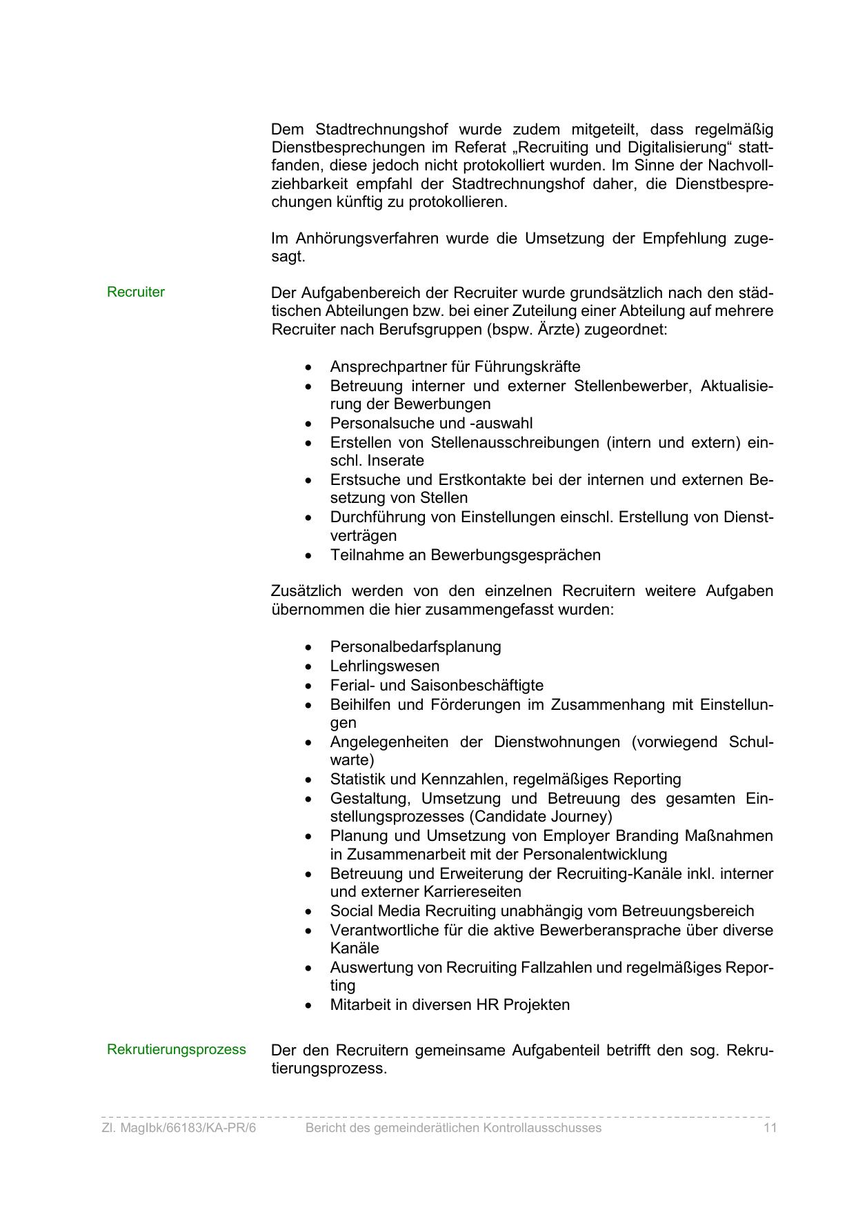 Dienstbesprechungen im Referat „Recruiting und Digitalisierung“ stattfanden, diese jedoch nicht protokolliert wurden. Im Sinne der Nachvollziehbarkeit empfahl der Stadtrechnungshof daher, die Dienstbesprechungen künftig zu protokollieren.