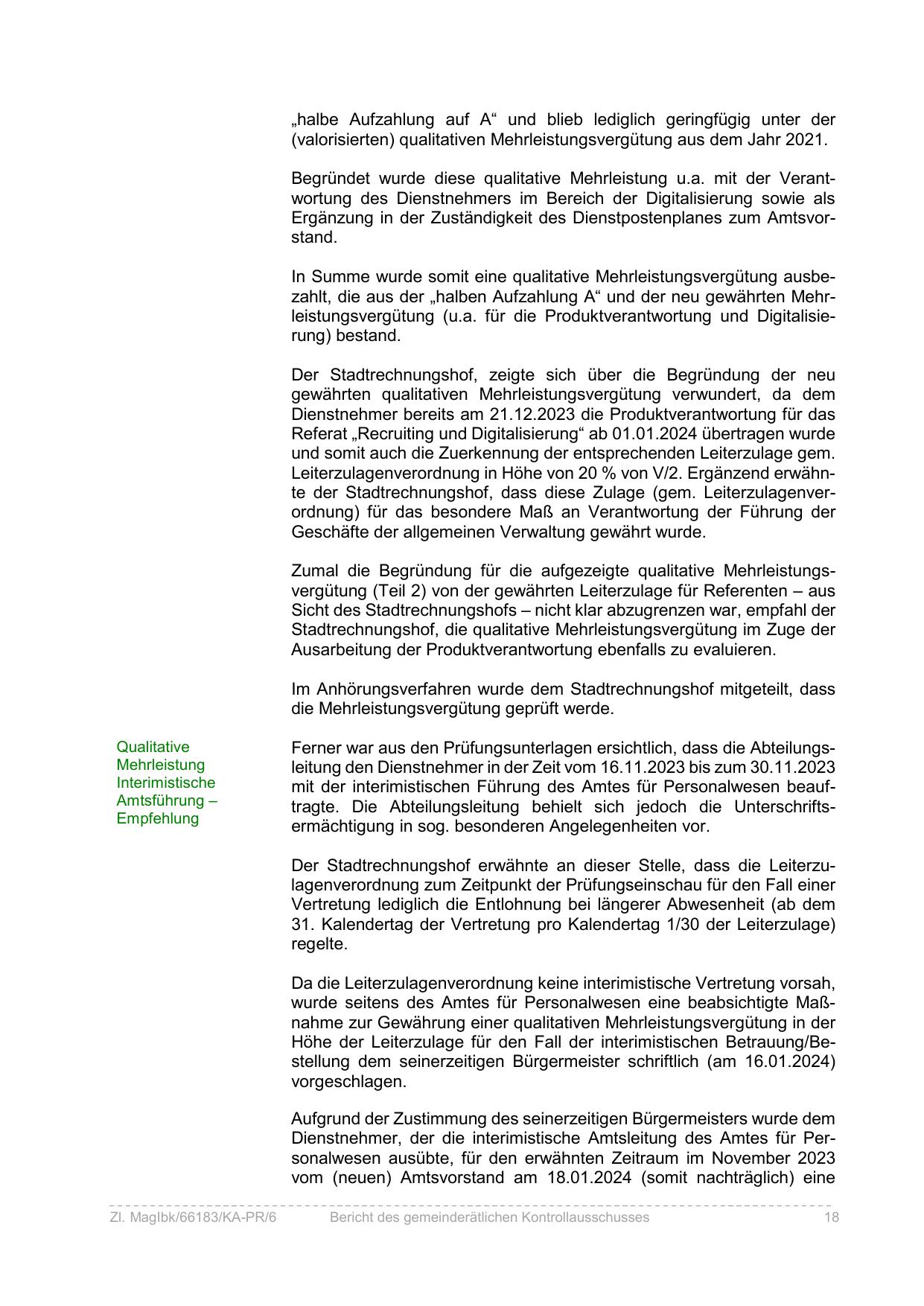 Der Stadtrechnungshof erwähnte an dieser Stelle, dass die Leiterzulagenverordnung zum Zeitpunkt der Prüfungseinschau für den Fall einer