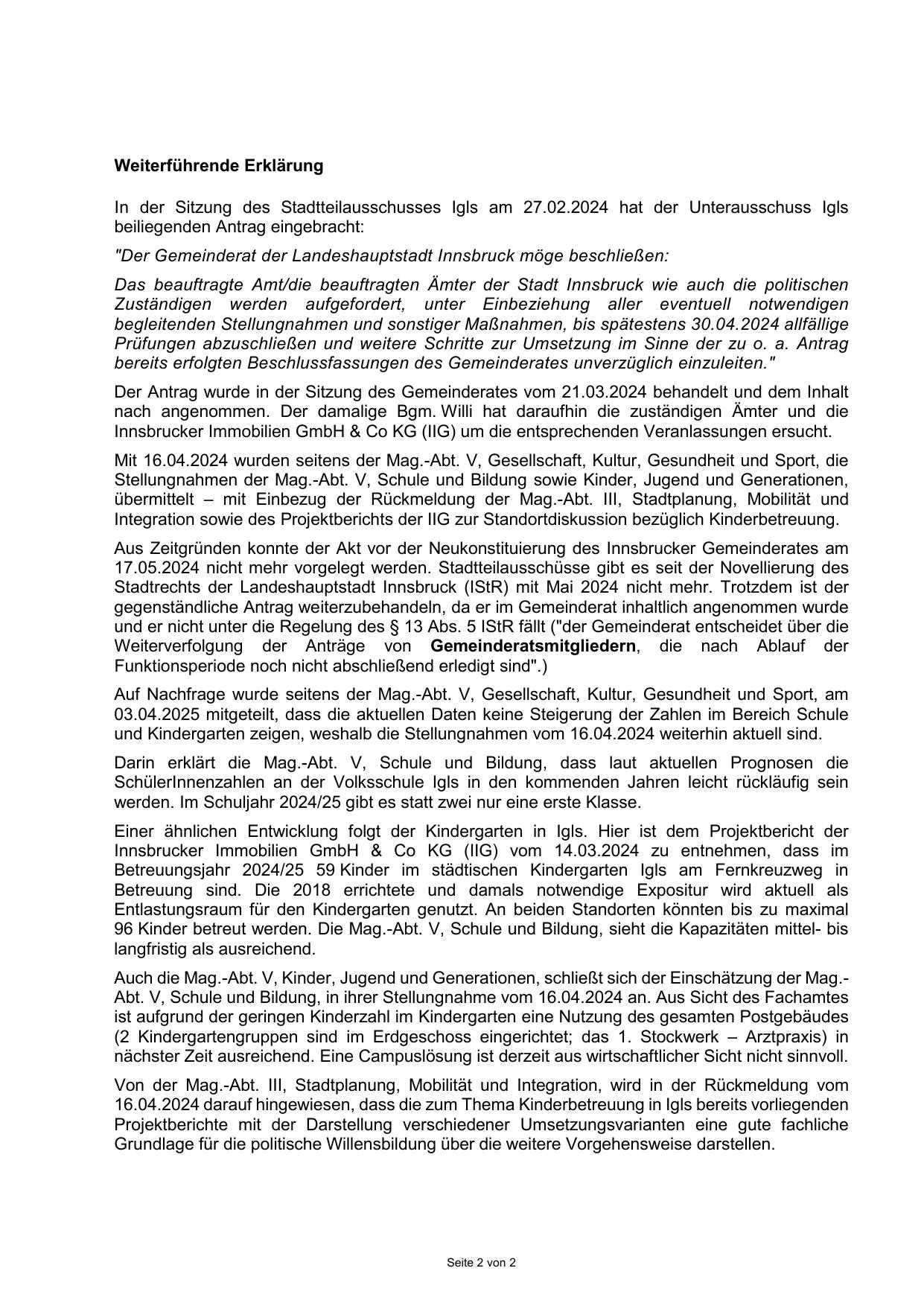 16.04.2024 darauf hingewiesen, dass die zum Thema Kinderbetreuung in Igls bereits vorliegenden