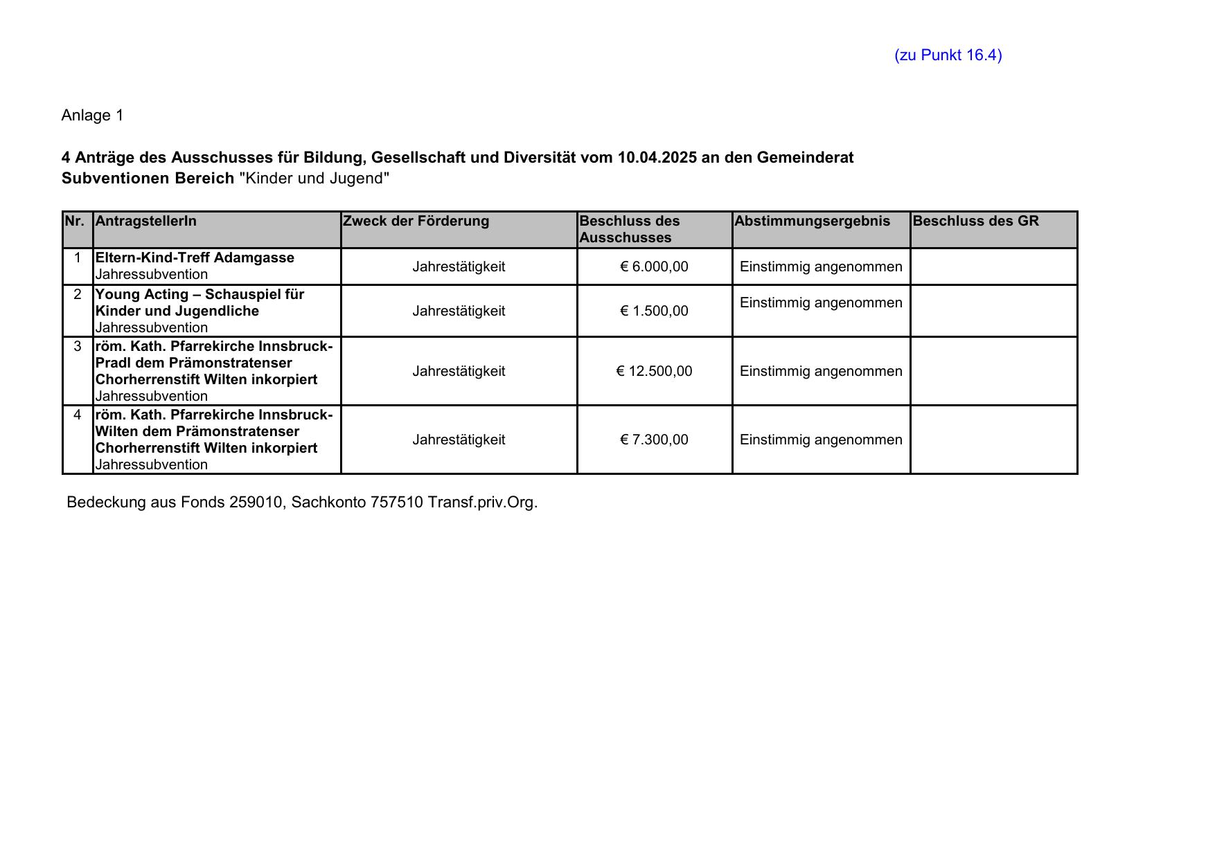 Bedeckung aus Fonds 259010, Sachkonto 757510 Transf.priv.Org.
