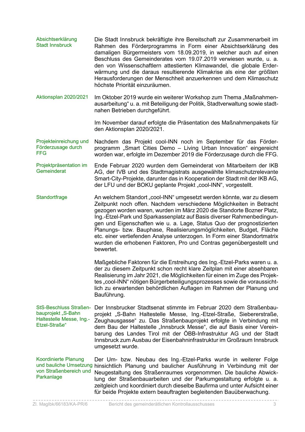 Realisierung im Jahr 2021, die Möglichkeiten für einen im Zuge des Projektes „cool-INN“ nötigen Bürgerbeteiligungsprozesses sowie die voraussichtlich zu erwartenden behördlichen Auflagen im Rahmen der Planung und