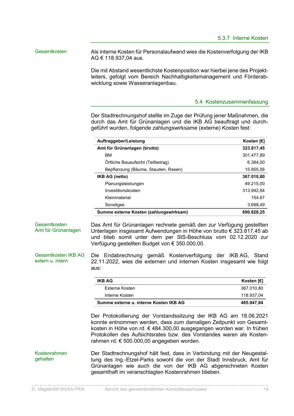Der Stadtrechnungshof hält fest, dass in Verbindung mit der Neugestaltung des Ing.-Etzel-Parks sowohl die von der Stadt Innsbruck, Amt für