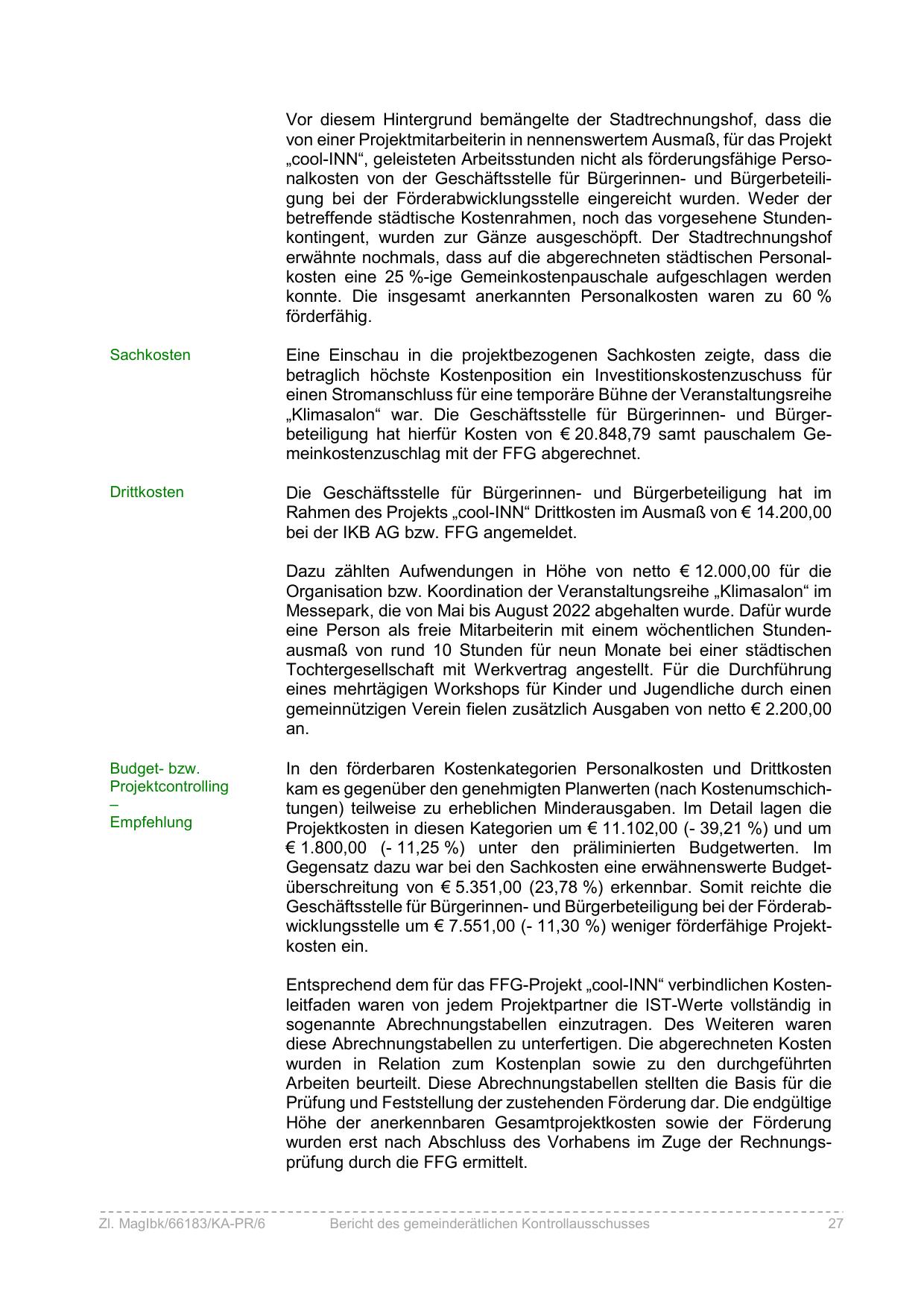 betreffende städtische Kostenrahmen, noch das vorgesehene Stundenkontingent, wurden zur Gänze ausgeschöpft. Der Stadtrechnungshof