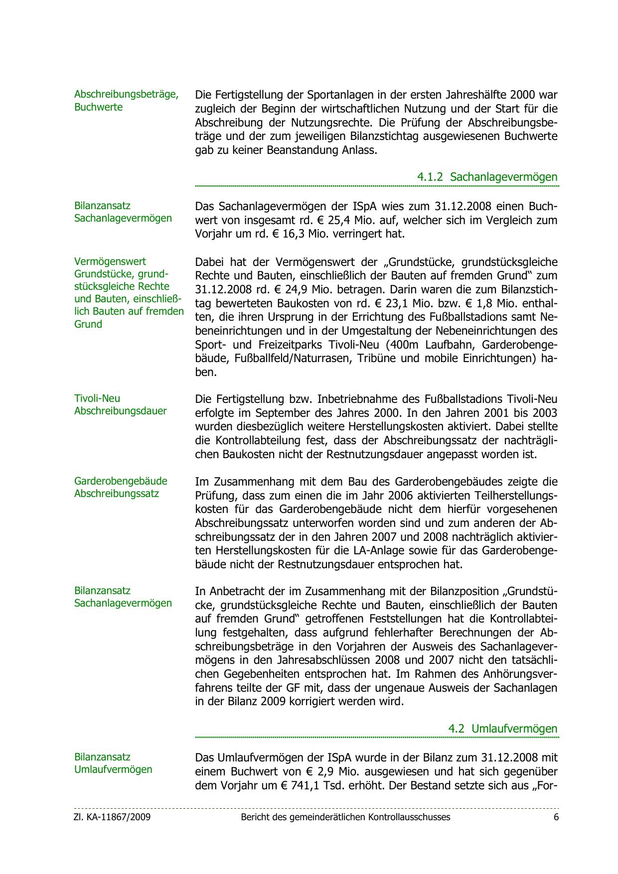 31.12.2008 rd. € 24,9 Mio. betragen. Darin waren die zum Bilanzstichtag bewerteten Baukosten von rd. € 23,1 Mio. bzw. € 1,8 Mio. enthalten, die ihren Ursprung in der Errichtung des Fußballstadions samt Nebeneinrichtungen und in der Umgestaltung der Nebeneinrichtungen des
