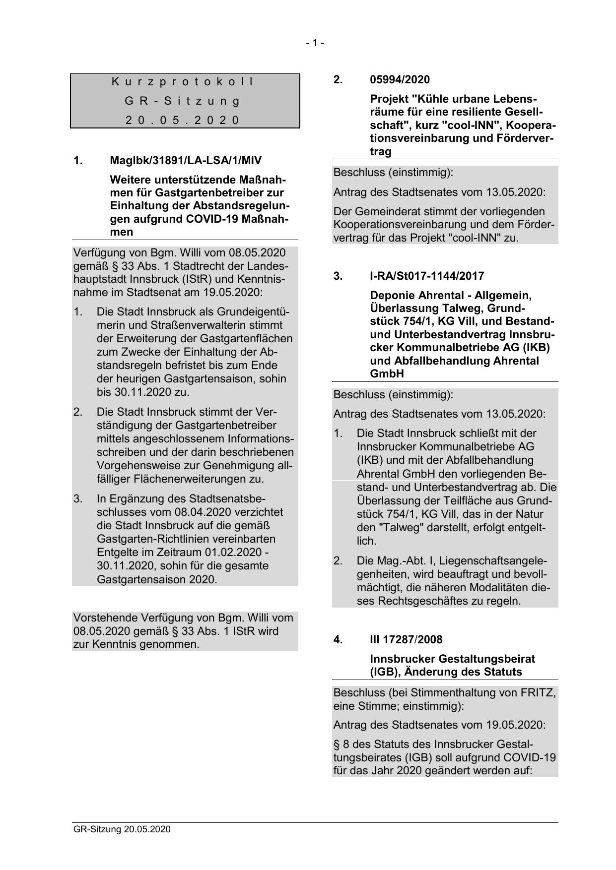 gemäß § 33 Abs. 1 Stadtrecht der Landeshauptstadt Innsbruck (IStR) und Kenntnisnahme im Stadtsenat am 19.05.2020: