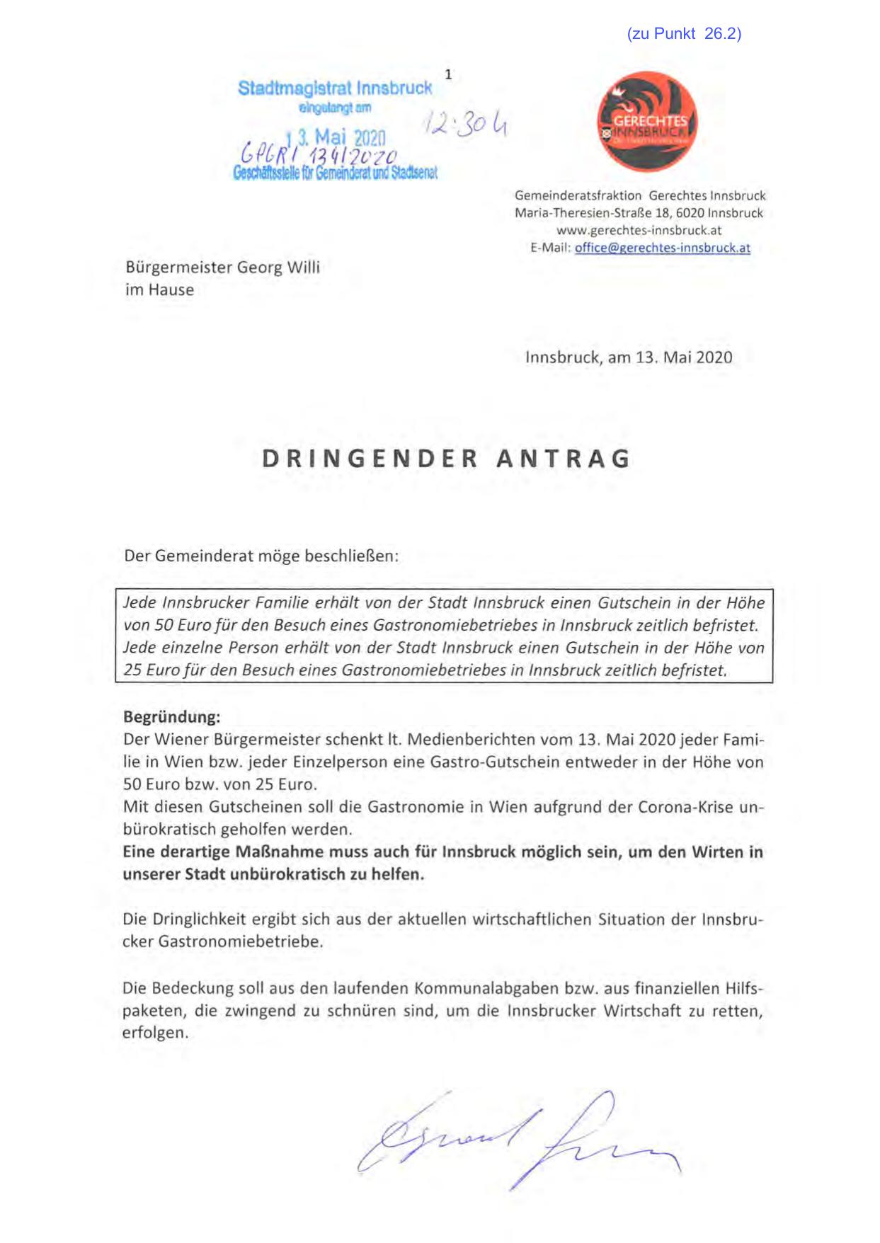 Die Dringlichkeit ergibt sich aus der aktuellen wirtschaftlichen Situation der lnnsbrucker Gastronomiebetriebe.