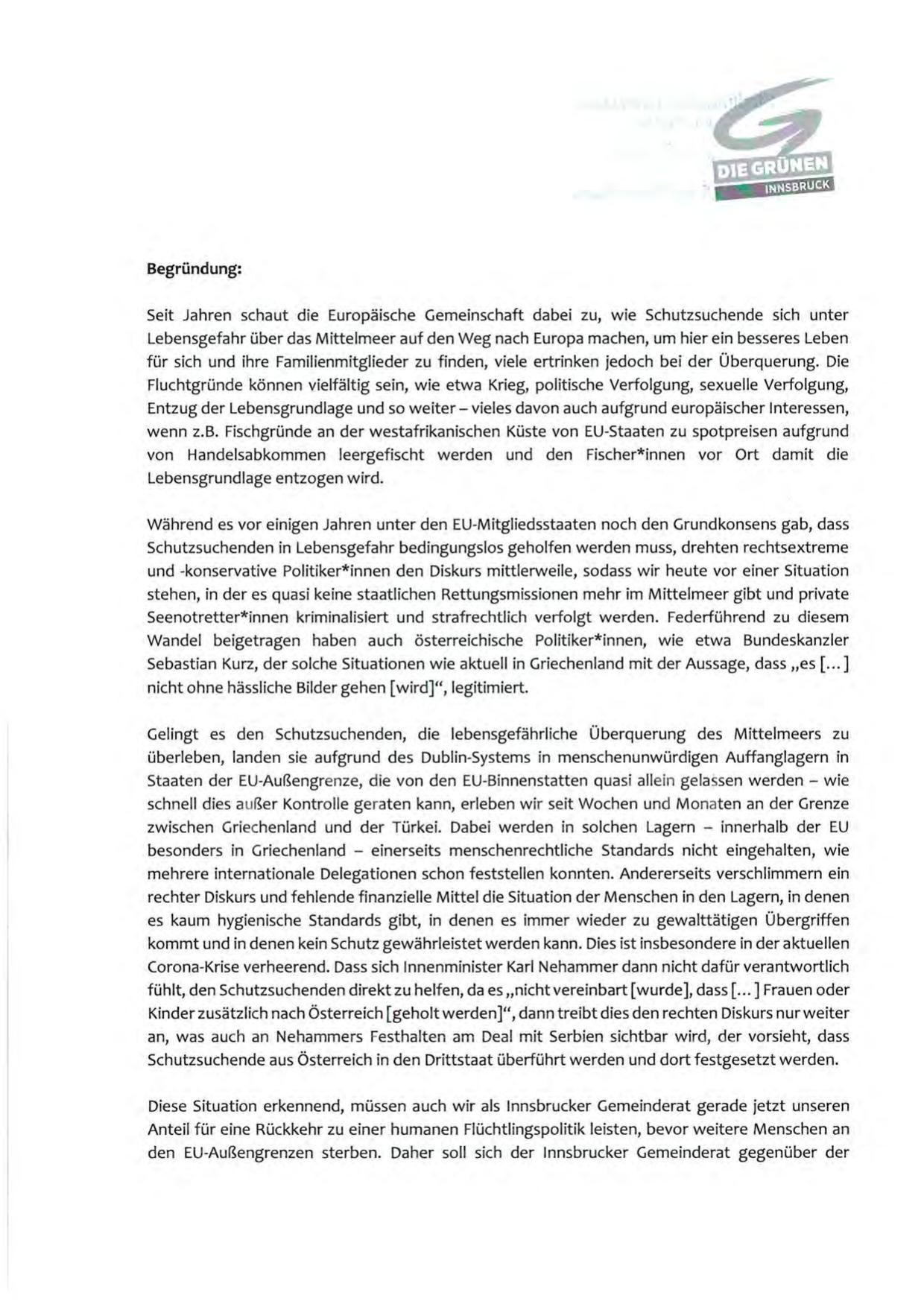 den EU-Außengrenzen sterben. Daher soll sich der lnnsbrucker Gemeinderat gegenüber der