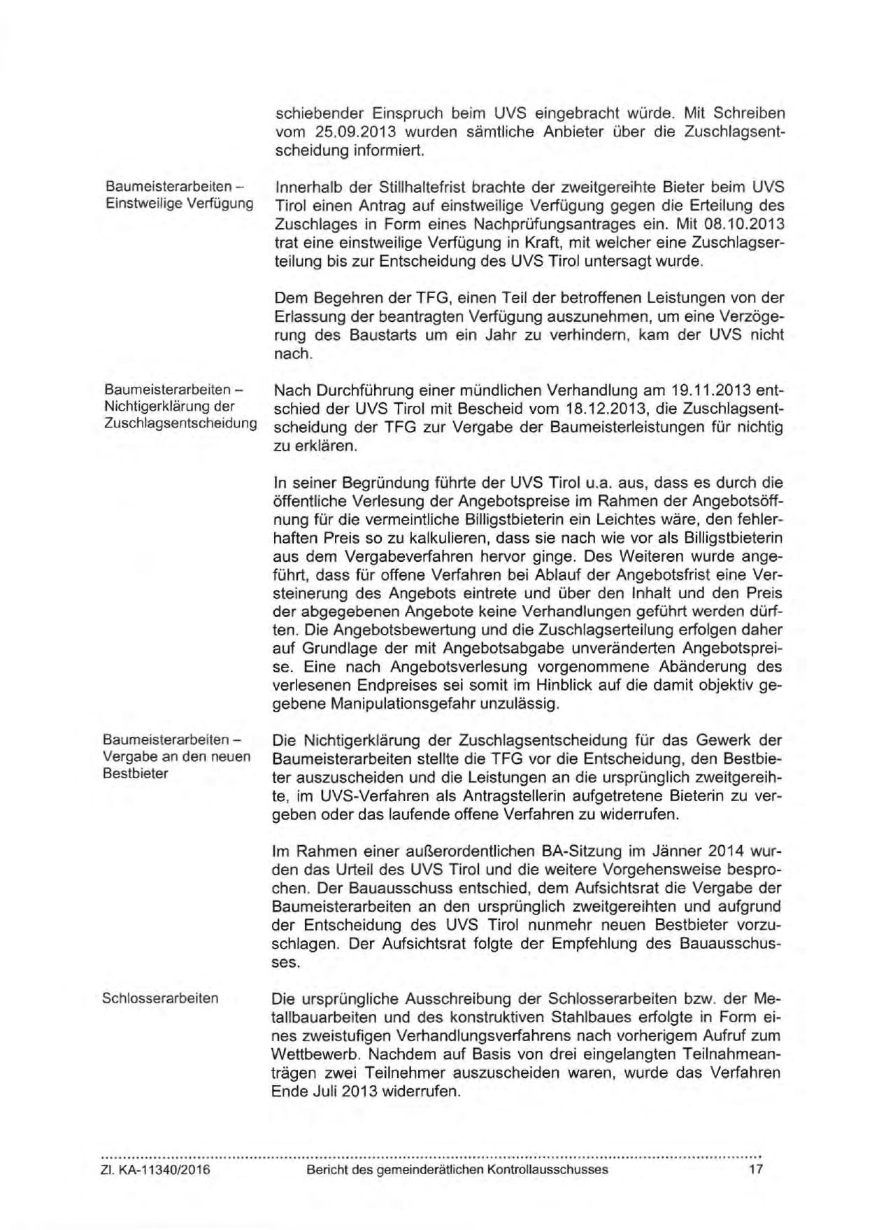 Im Rahmen einer außerordentlichen BA-Sitzung im Jänner 2014 wurden das Urteil des UVS Tiral und die weitere Vorgehensweise besprochen. Der Bauausschuss entschied, dem Aufsichtsrat die Vergabe der